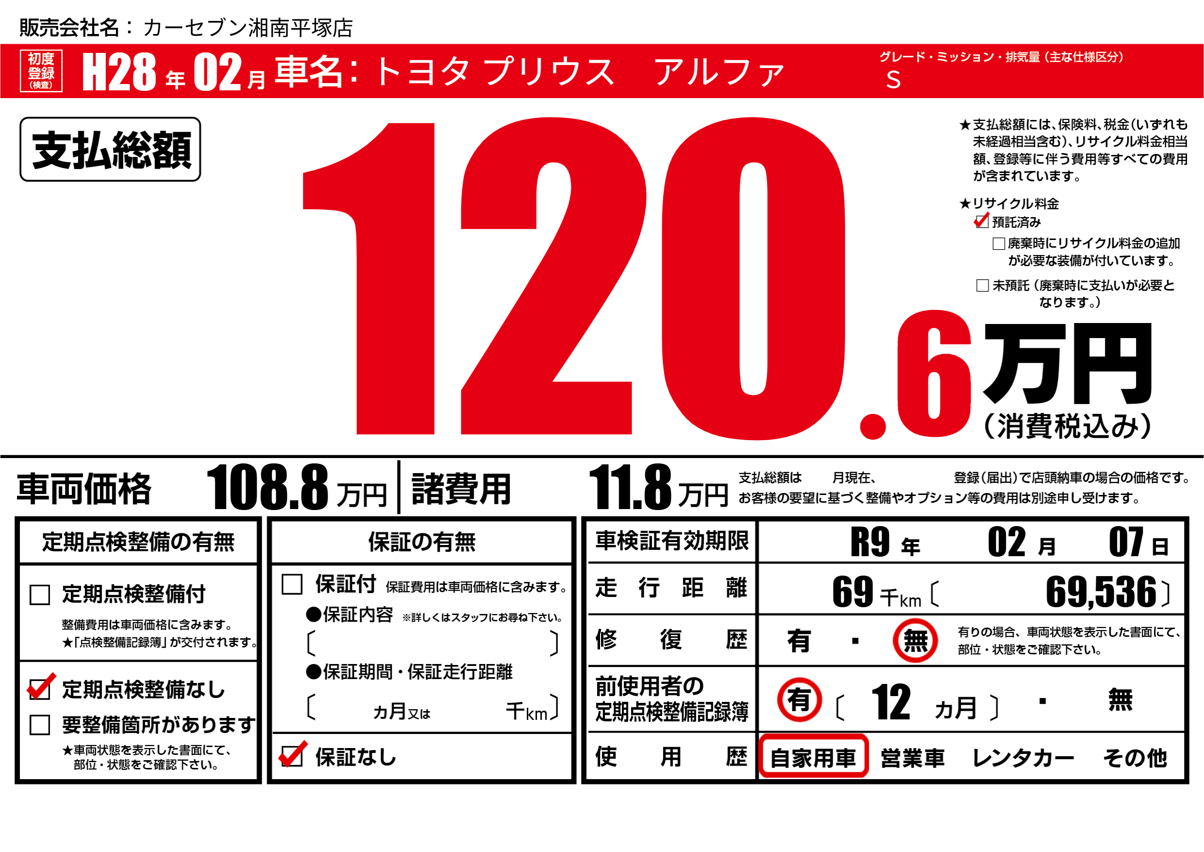 | 走行キロ | 6.9万km | 初年度登録 | H28年02月 |