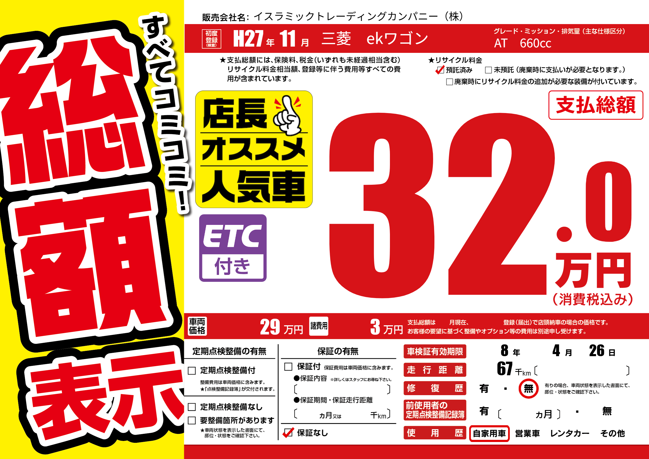 | 走行キロ | 6.7万km | 初年度登録 | H27年11月 |