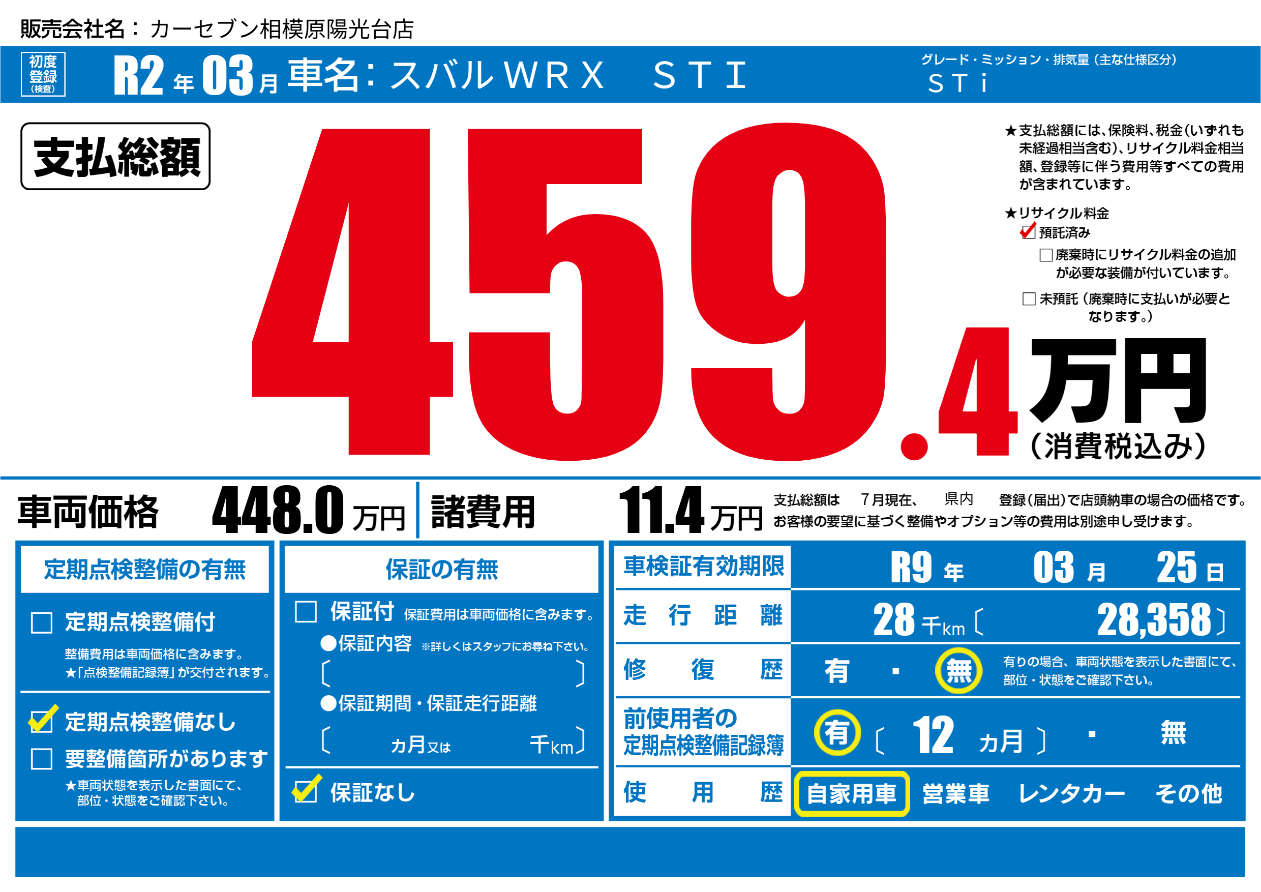 | 車検制限 | R9年 03月 25日 | ||