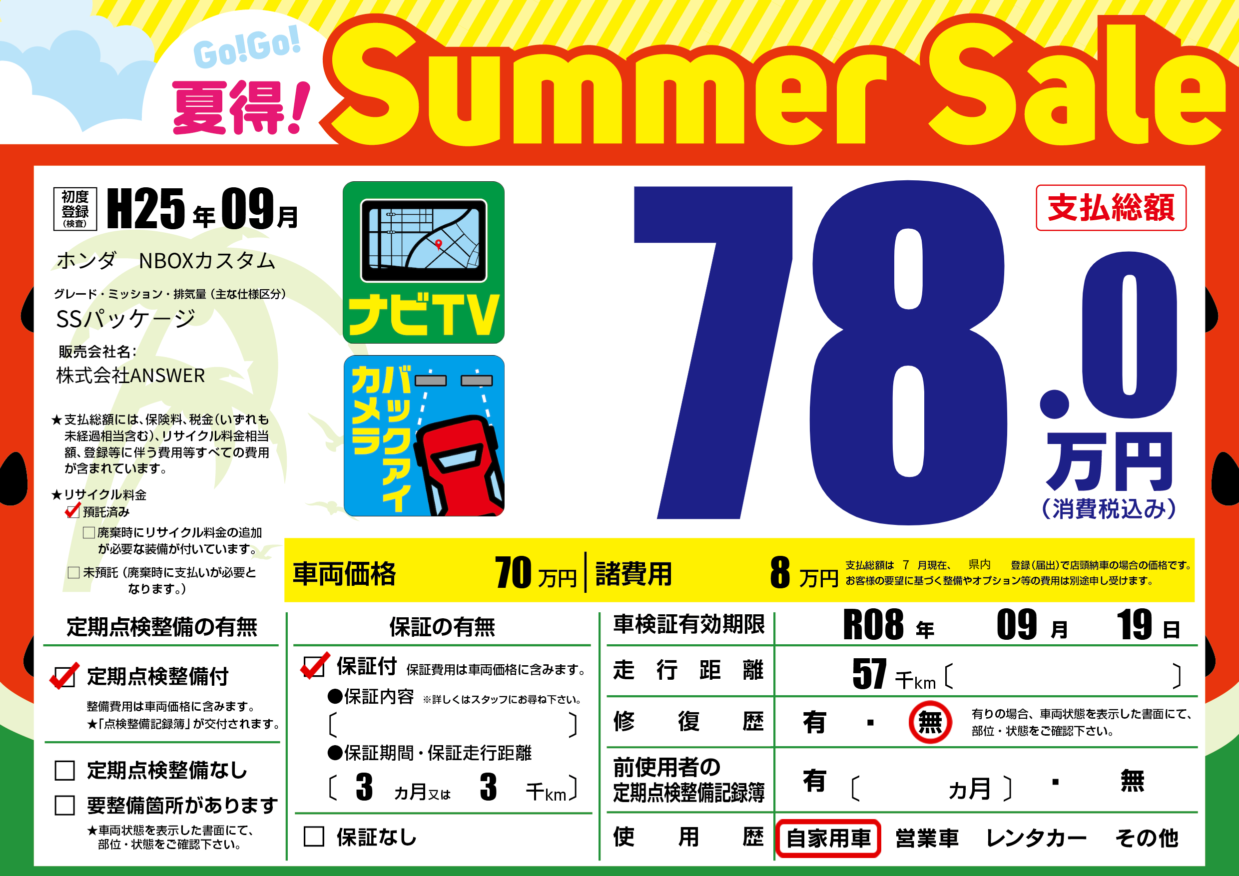 | 車名 | ホンダ NBOXカスタム | グレード ミッション 排気量 |