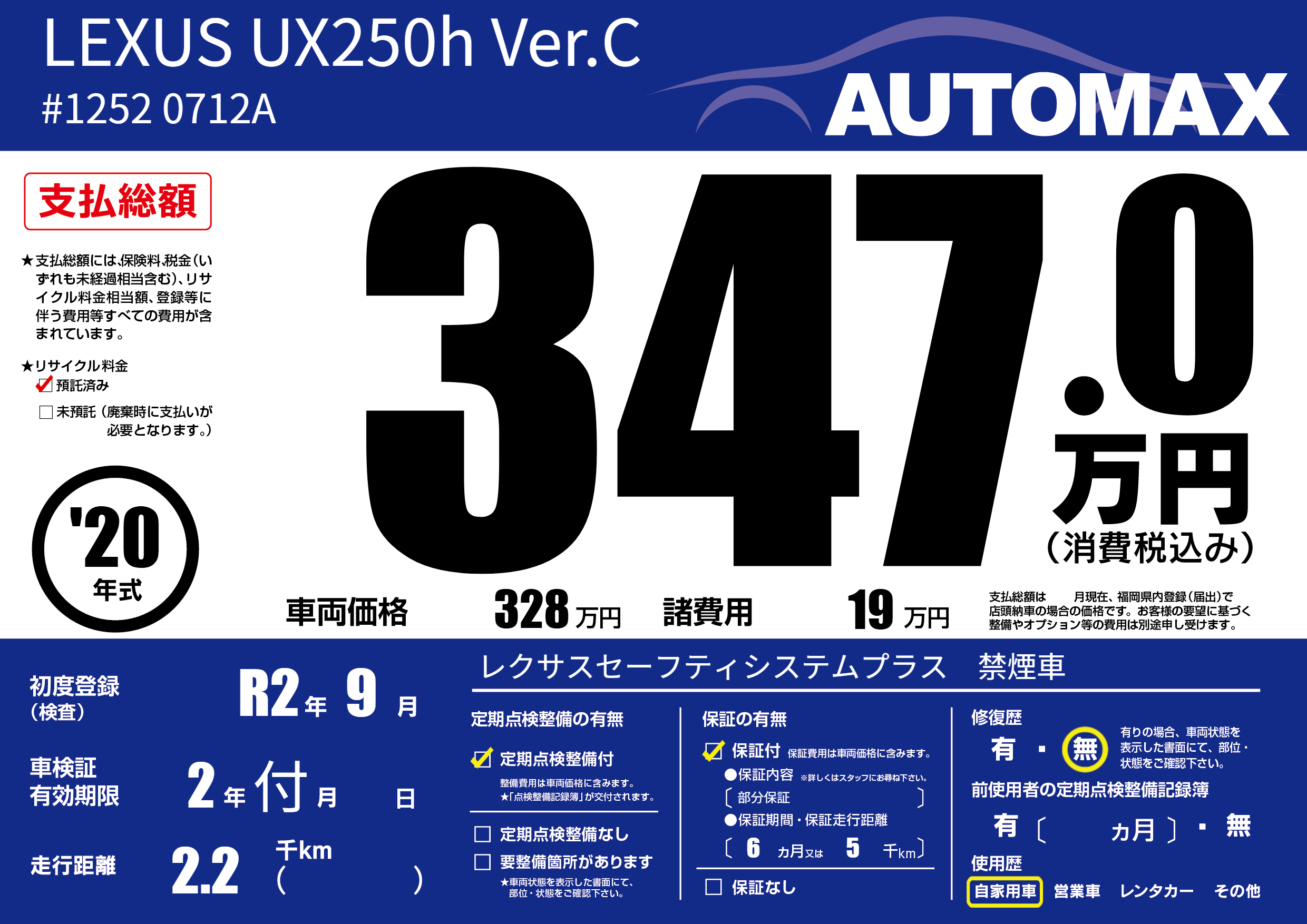 | 車名 | LEXUS UX250h Ver.C | グレード ミッション 排気量 |