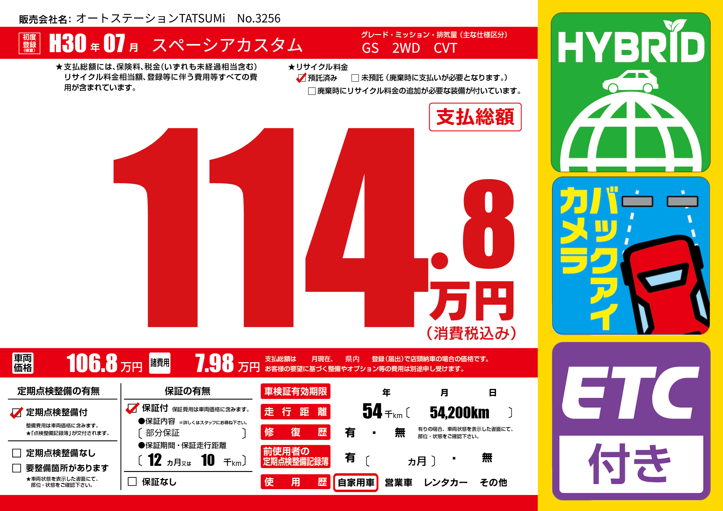 | 車名 | スペーシアカスタム | グレード ミッション 排気量 |