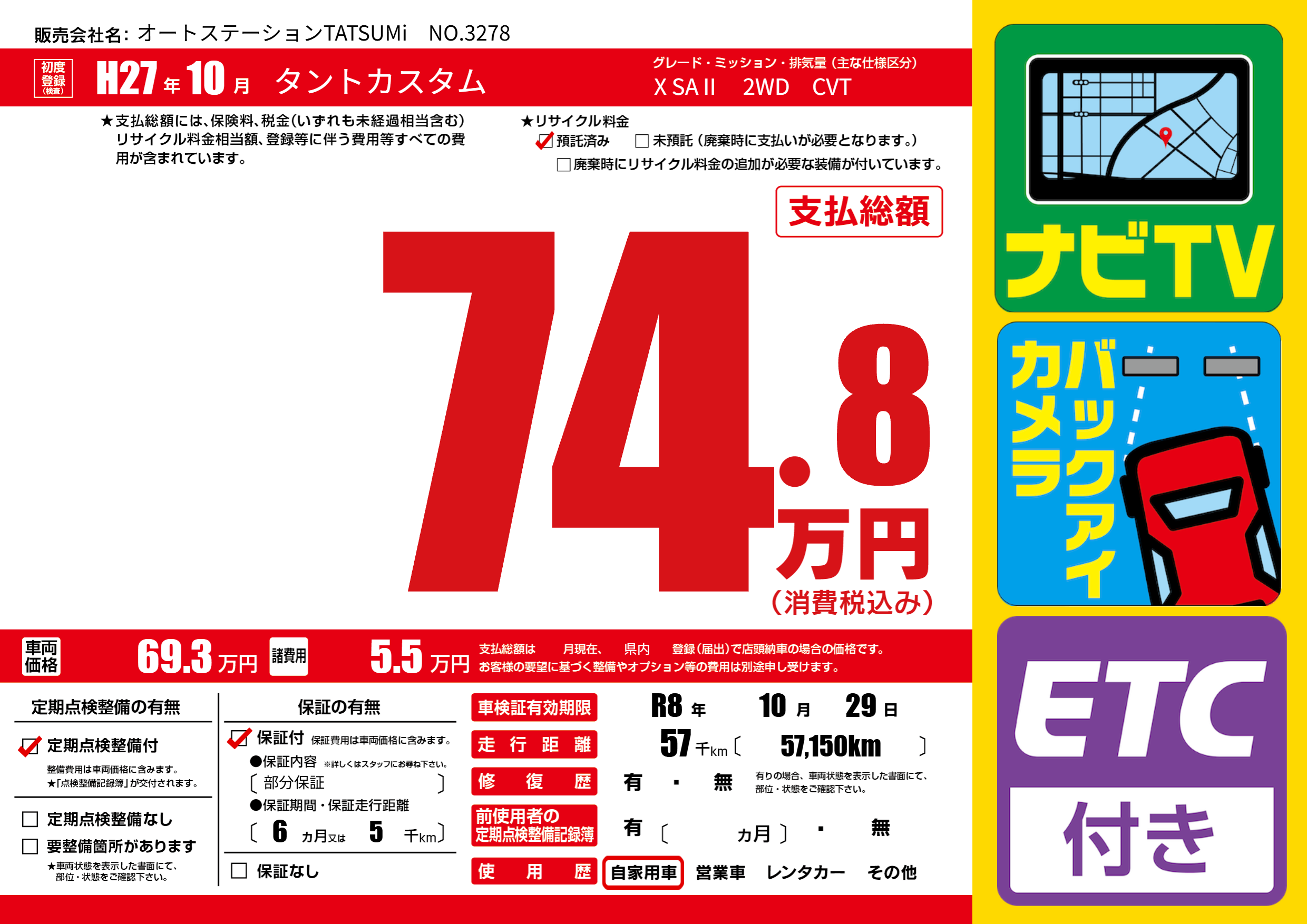 | 車名 | タントカスタム | グレード ミッション 排気量 |