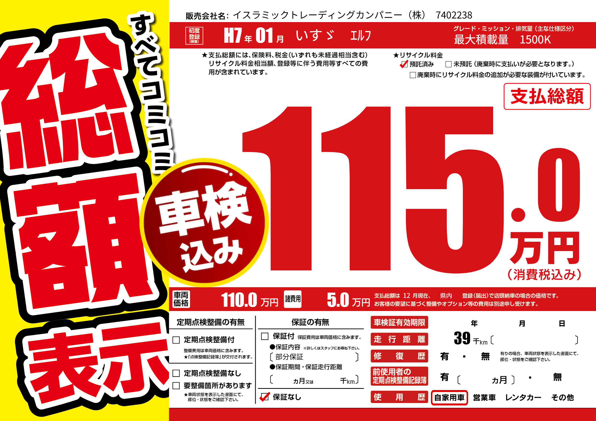 | 車名 | いすゞ エルフ | グレード ミッション 排気量 |