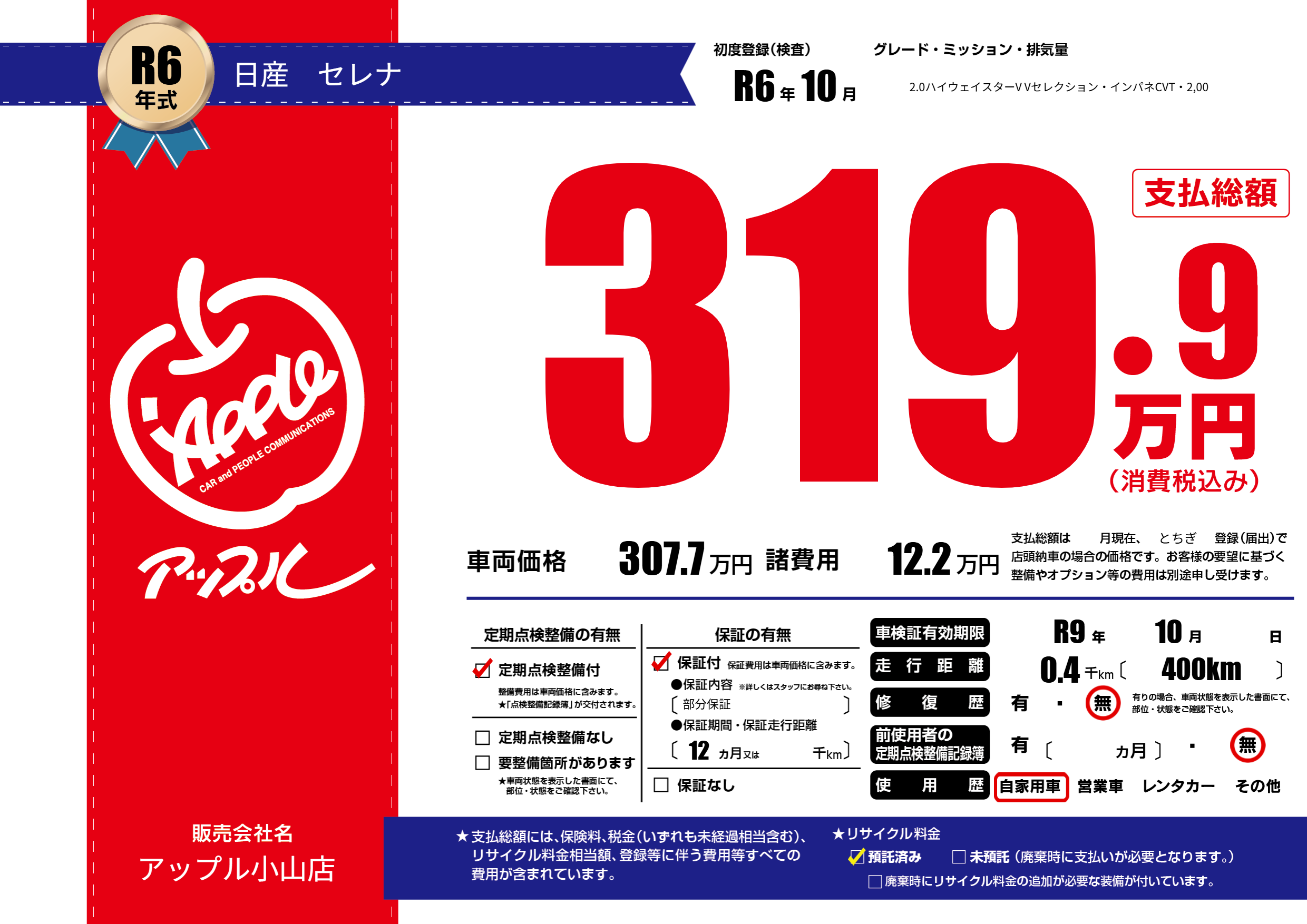 | 走行キロ | - | 初年度登録 | R6年10月 |