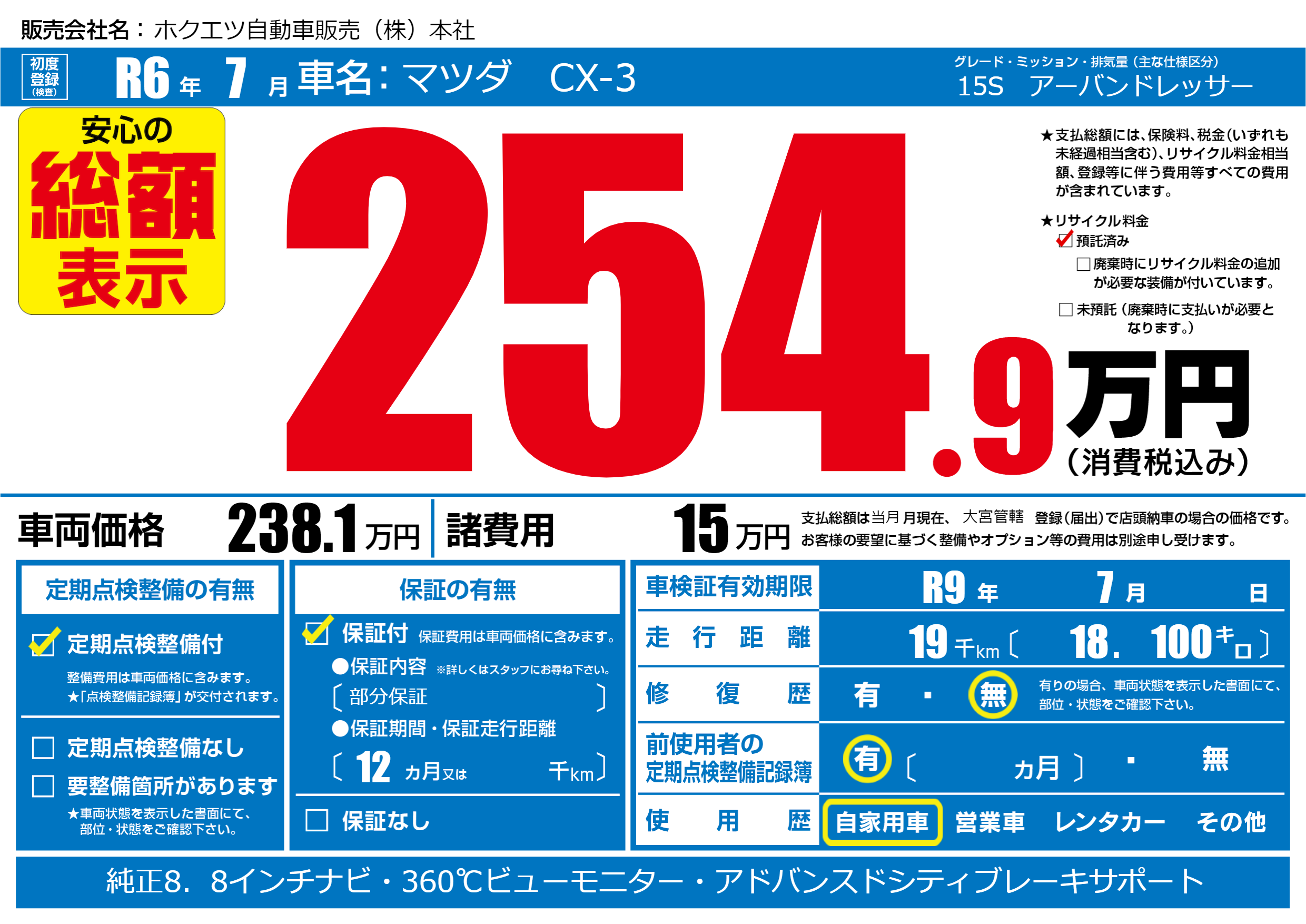 | 車名 | マツダ CX-3 | グレード ミッション 排気量 |