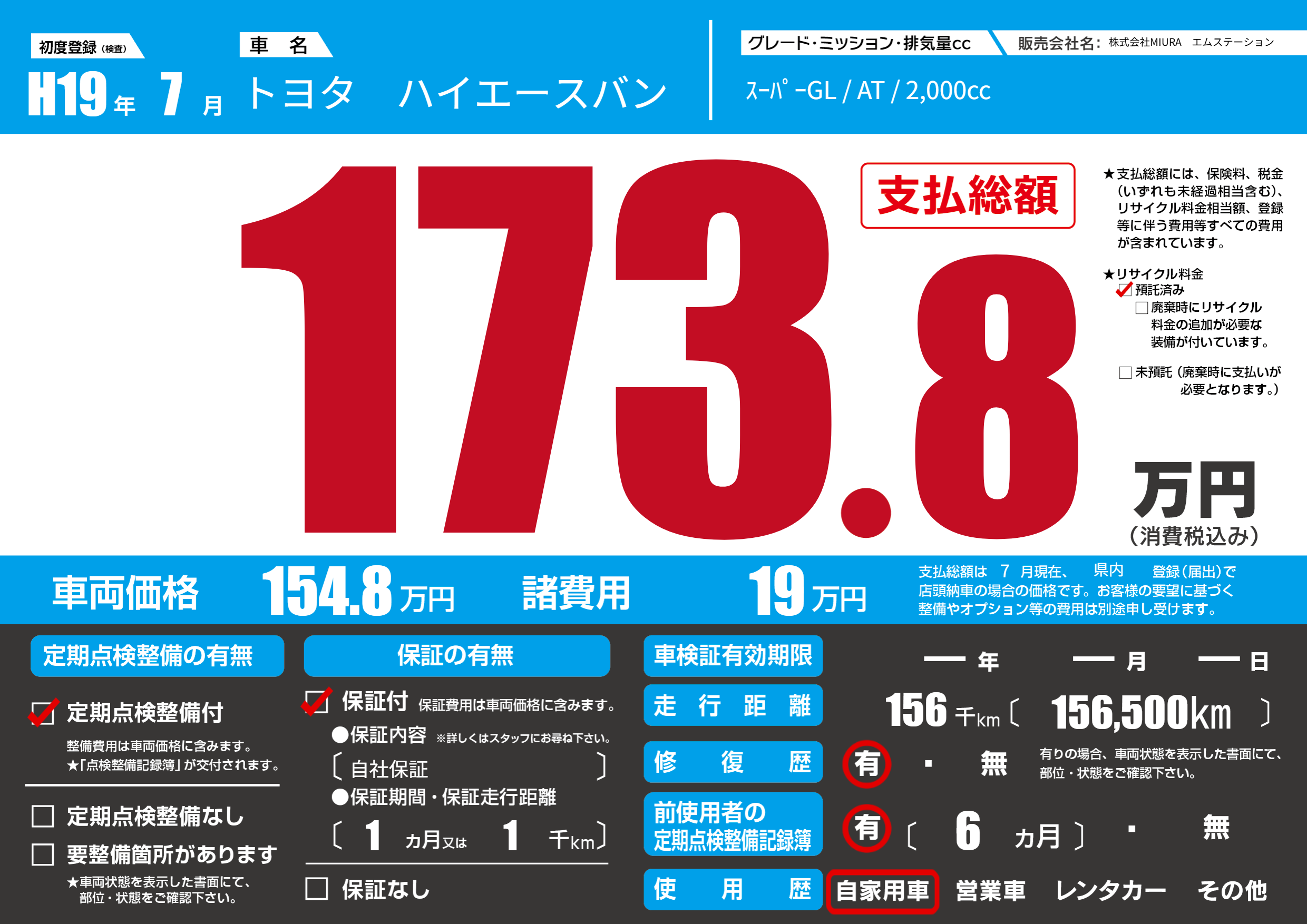 | 走行キロ | 15.6万km | 初年度登録 | H19年7月 |