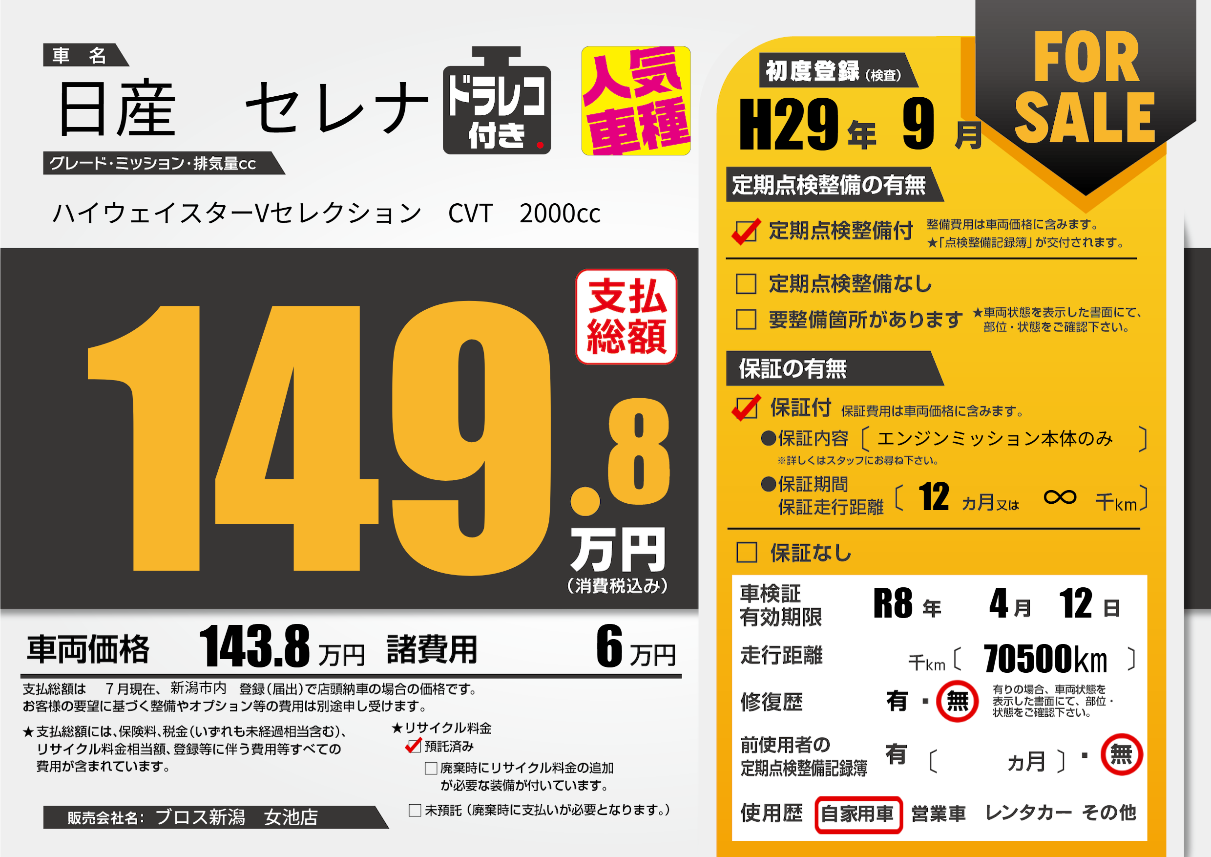 | 車名 | 日産 セレナ | グレード ミッション 排気量 |