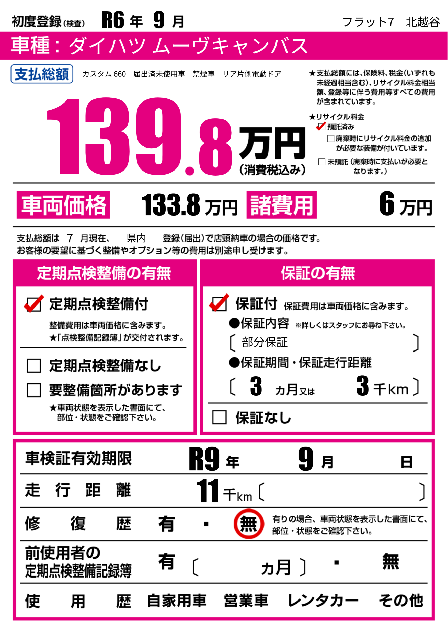 なし | 車検制限 | R9年9月---月 |