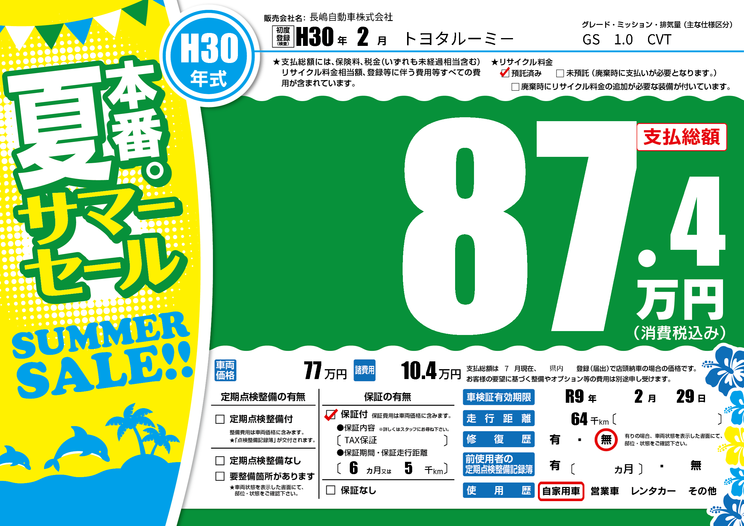 | 走行キロ | 6.4万km | 初年度登録 | H30年2月 |