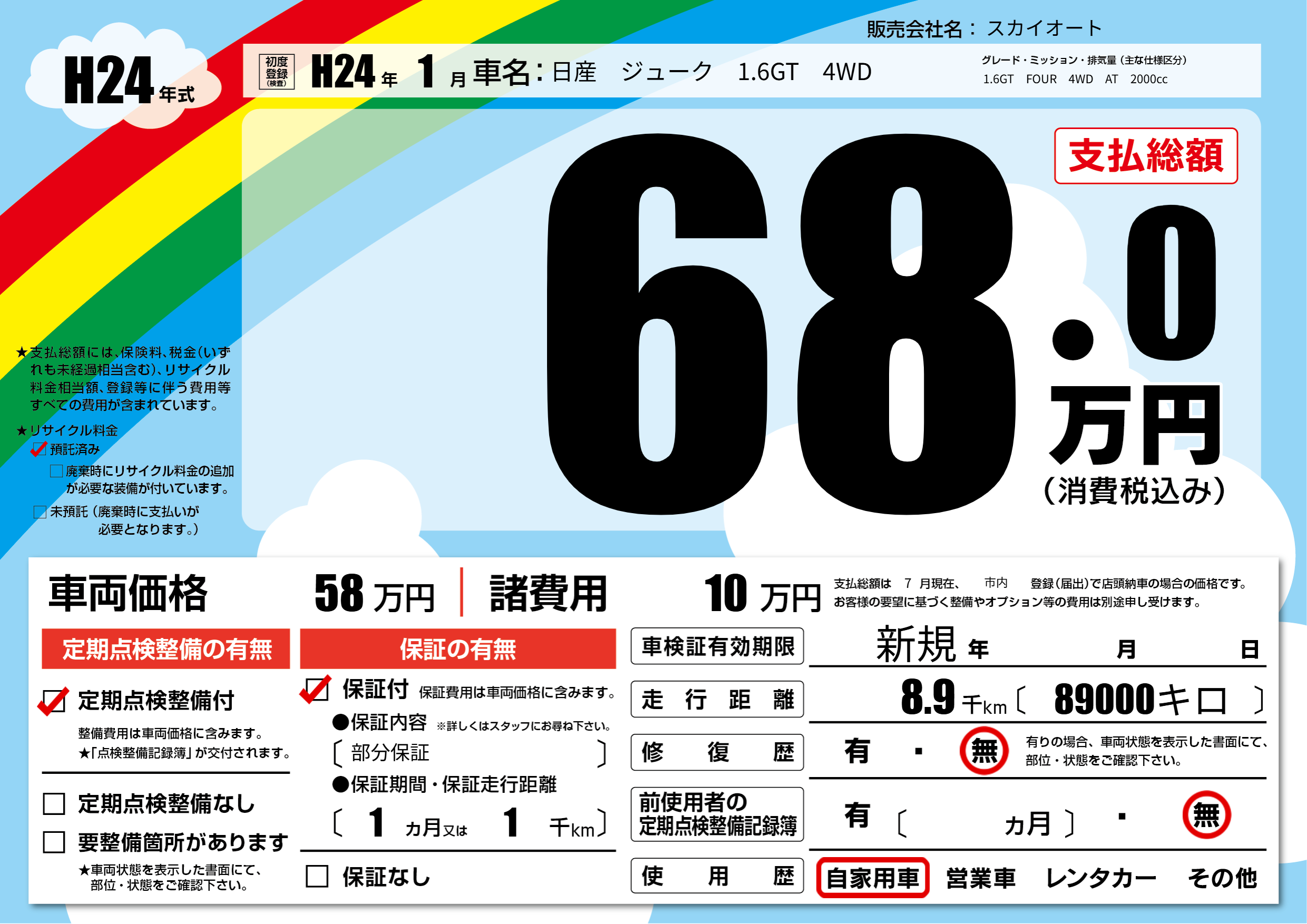 | 車名 | 日産 ジューク 1.6GT 4WD | グレード ミッション 排気量 |