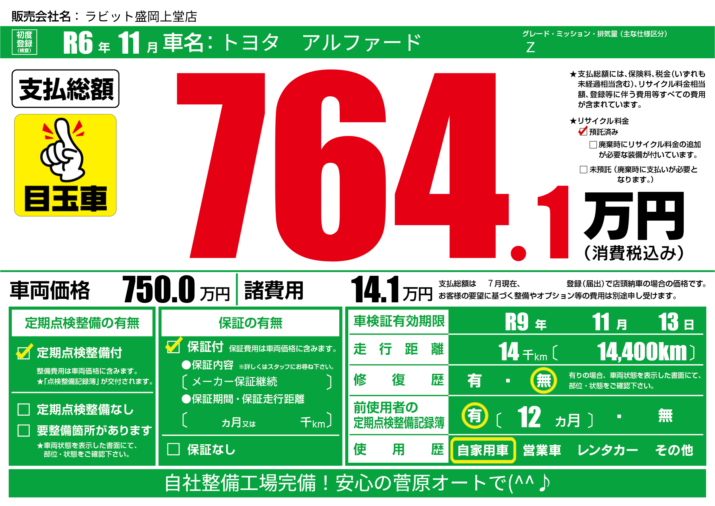 | 走行キロ | 1.4万km | 初年度登録 | R6年11月 |