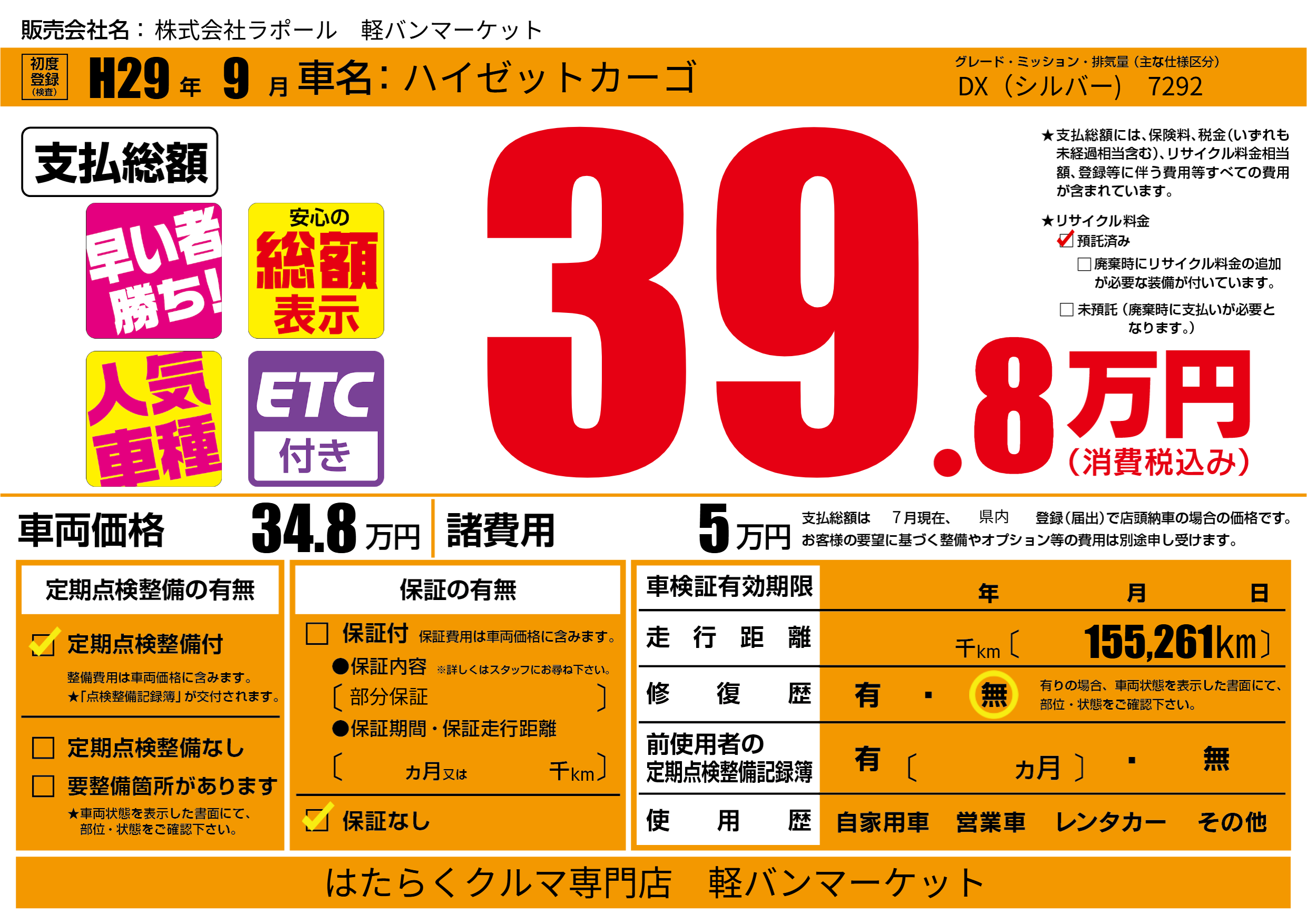 保証なし 保証内容(部分保証) ---ヶ月または()千kmまで |