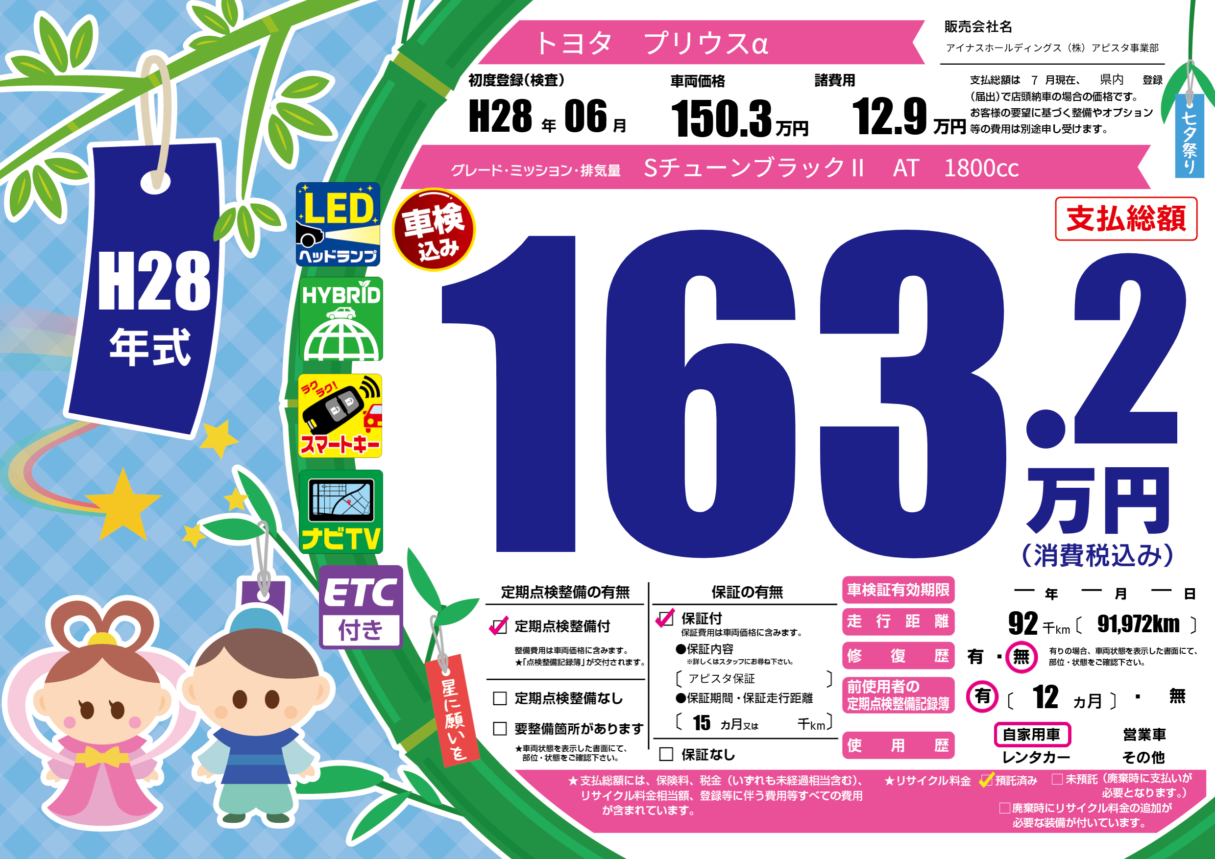 | 車名 | トヨタ プリウスα | グレード ミッション 排気量 |