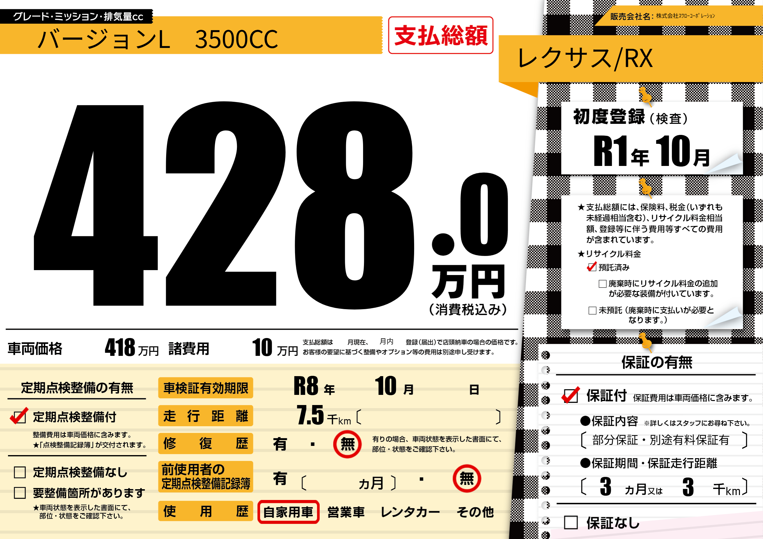 | 車名 | レクサス/RX | グレード ミッション 排気量 |
