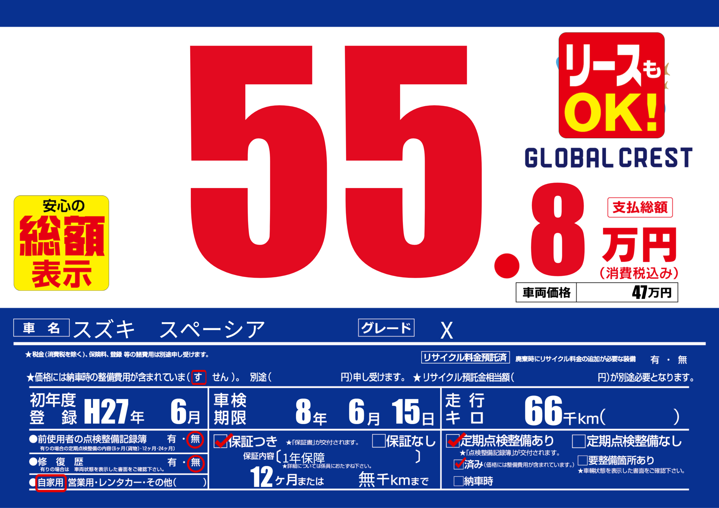| 走行キロ | 6.6万km | 初年度登録 | H27年6月 |