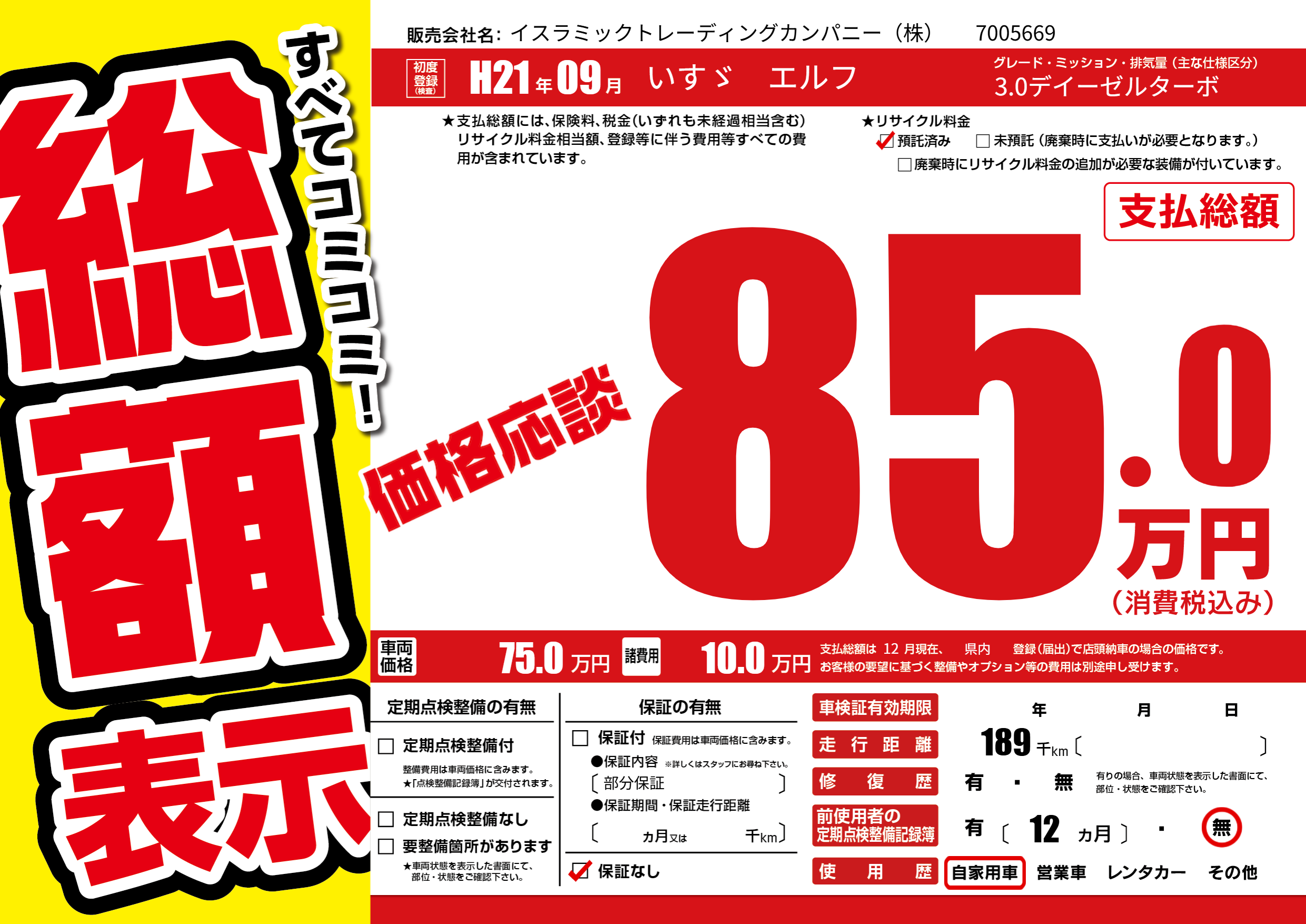 | 車名 | いすゞ エルフ | グレード ミッション 排気量 |