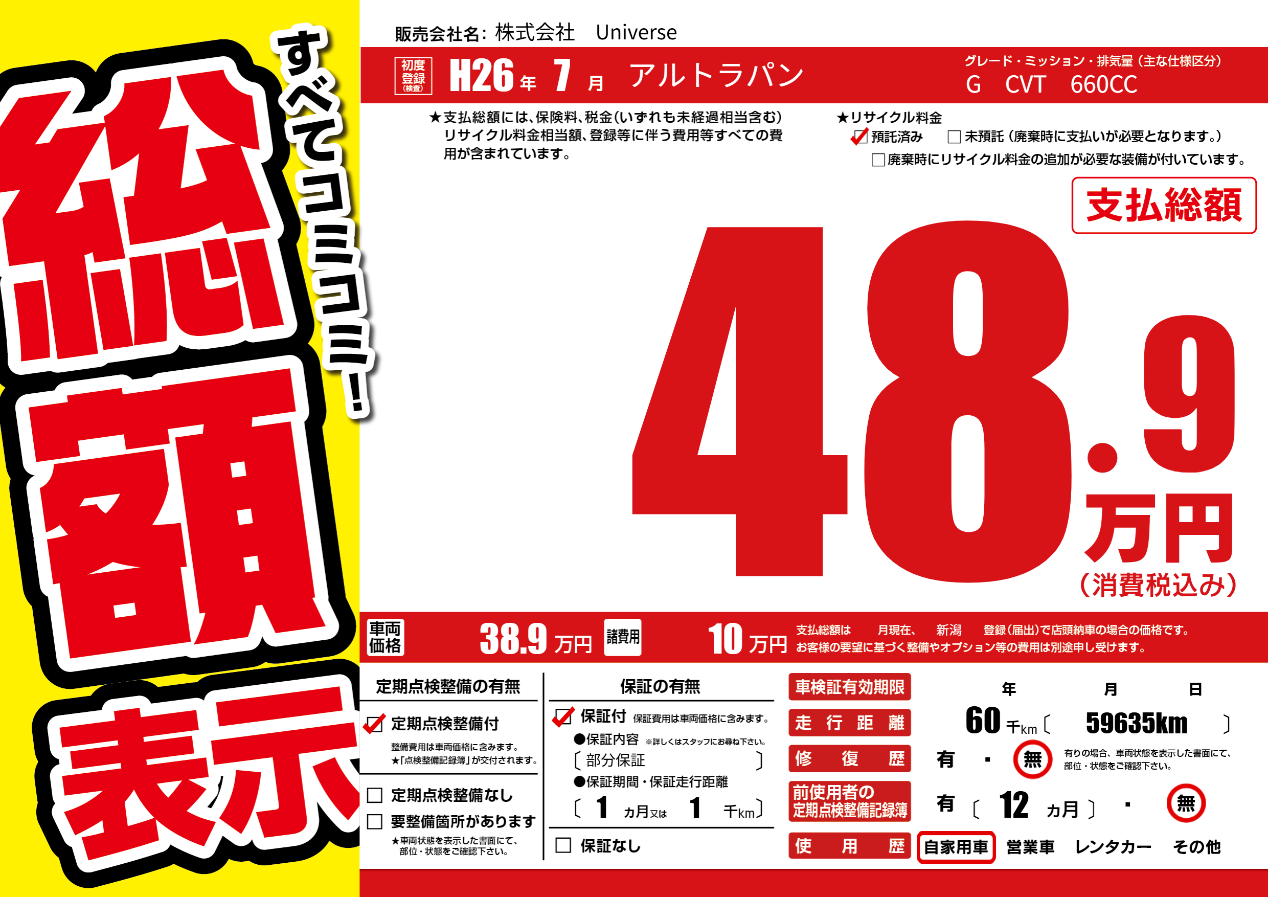 | 走行キロ | 6万km | 初年度登録 | H26年7月 |