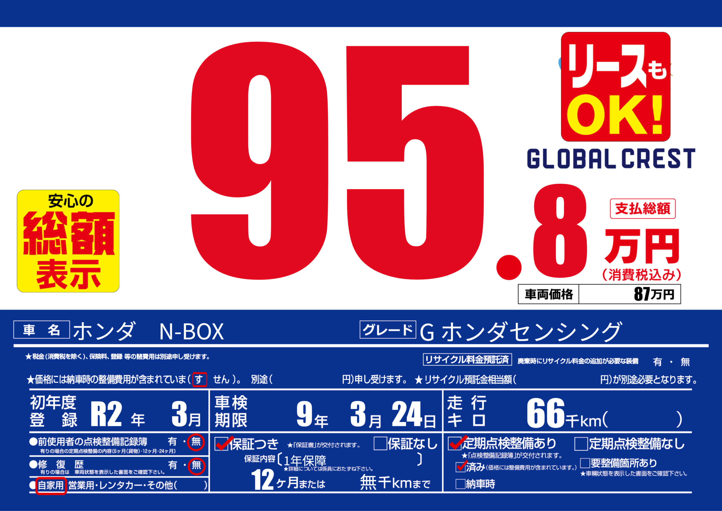 | 定期点検整備 | 定期点検整備あり 定期点検整備済み | ||