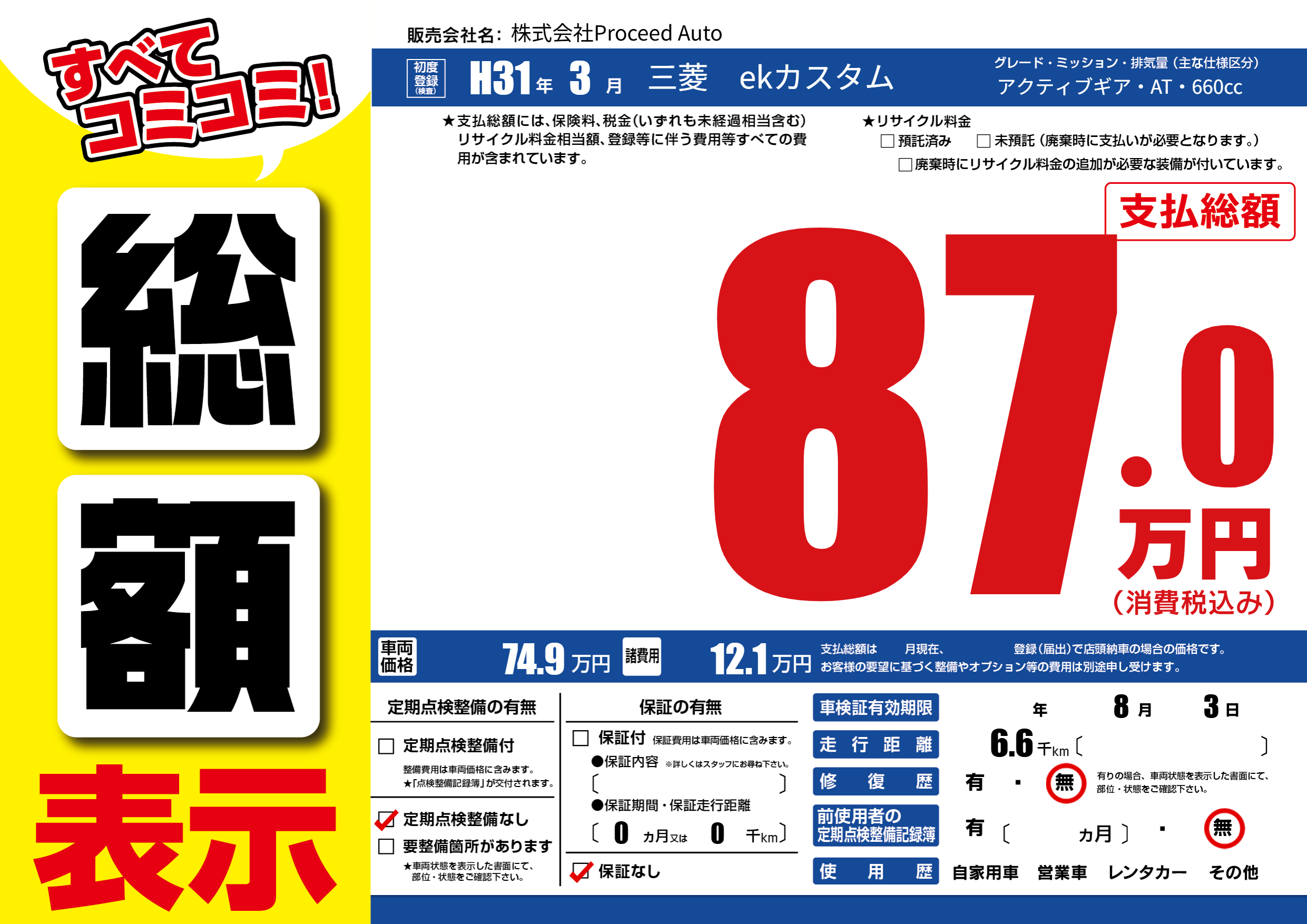 | 車名 | 三菱 ekカスタム | グレード ミッション 排気量 |