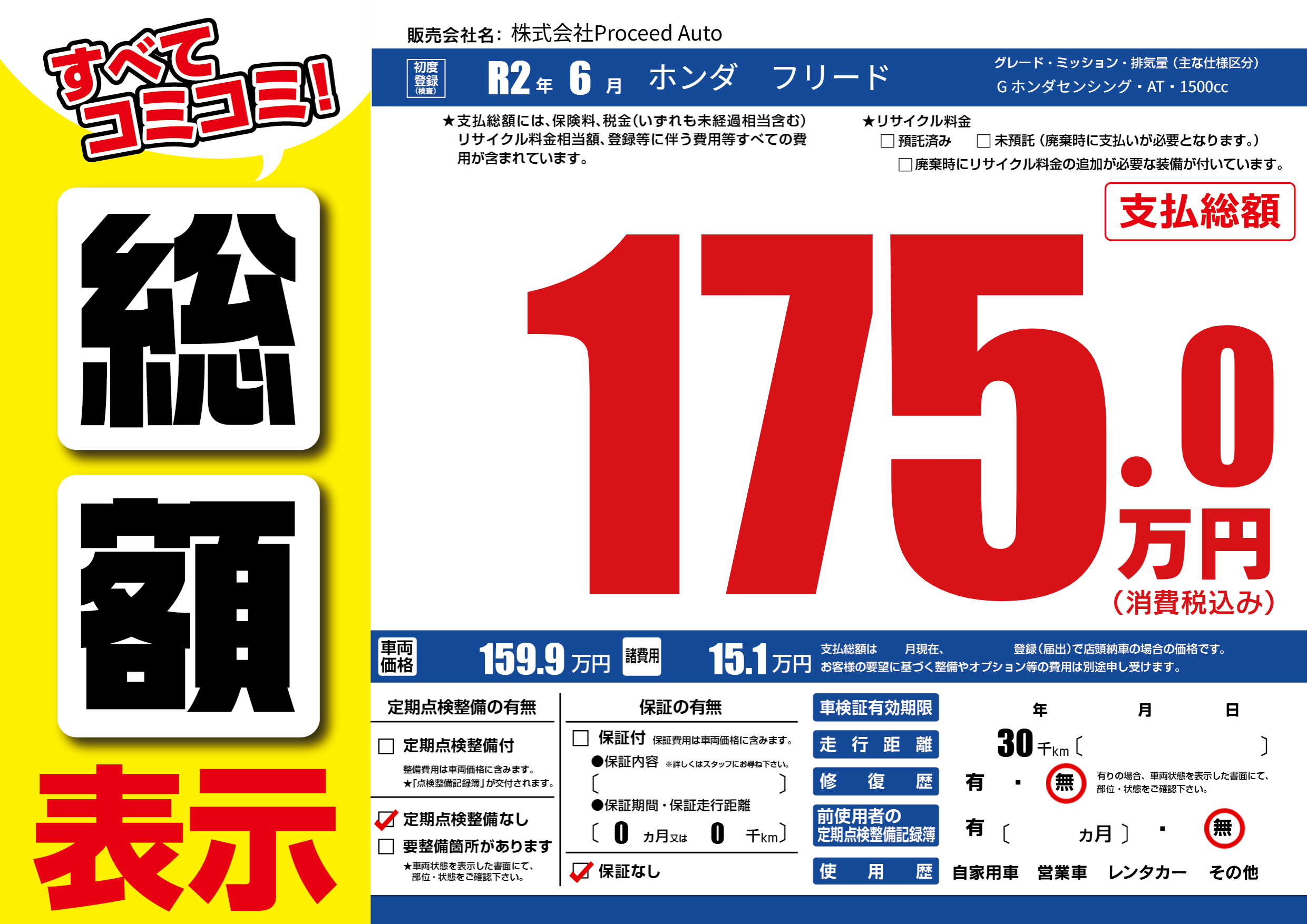 | 車名 | ホンダ フリード | グレード ミッション 排気量 |