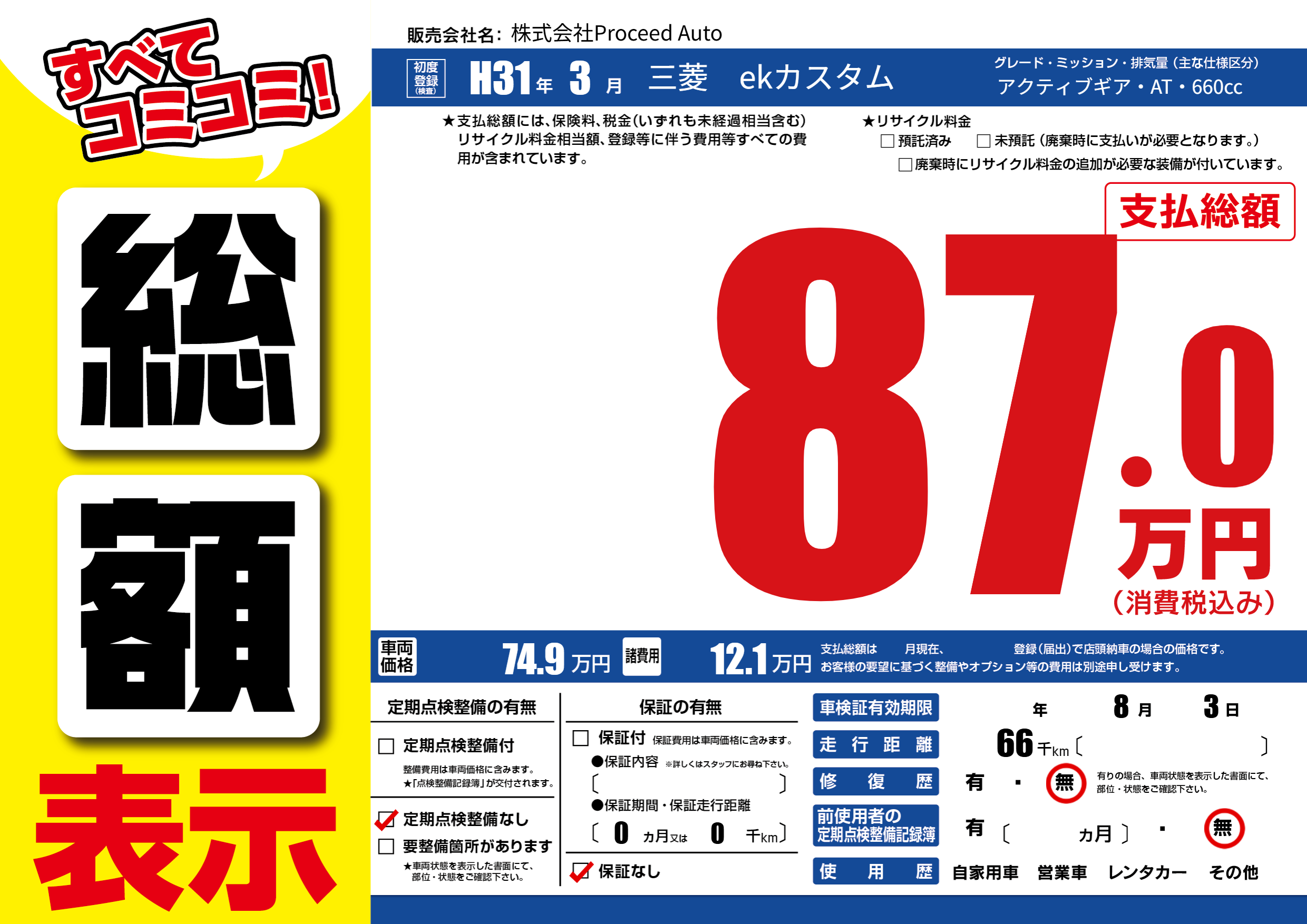 | 走行キロ | 6.6万km | 初年度登録 | H31年3月 |
