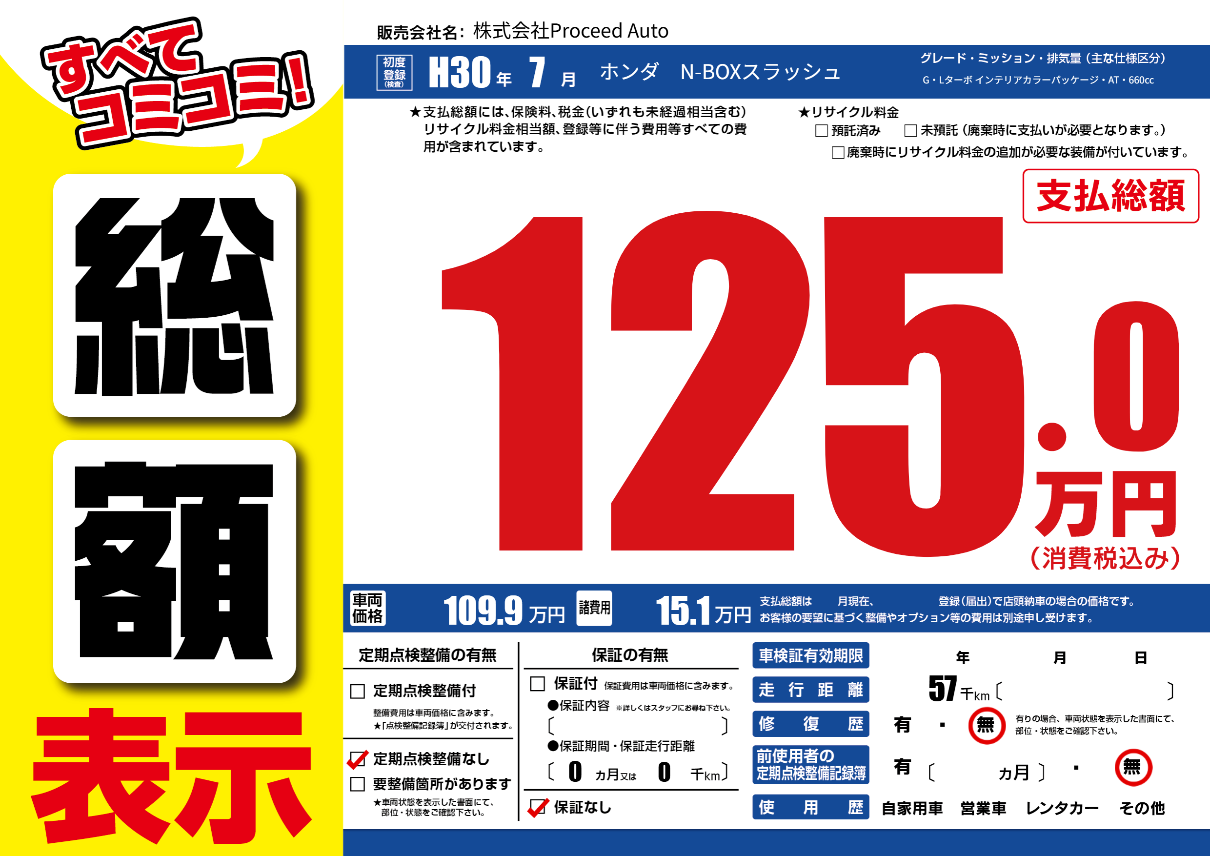 | 車名 | ホンダ N-BOXスラッシュ | グレード ミッション 排気量 |