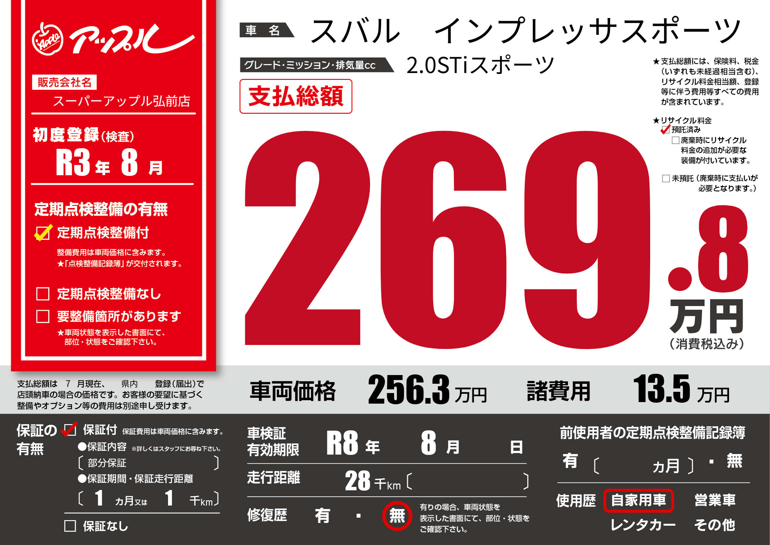 | 車検制限 | R8年 8月 - 日 | ||