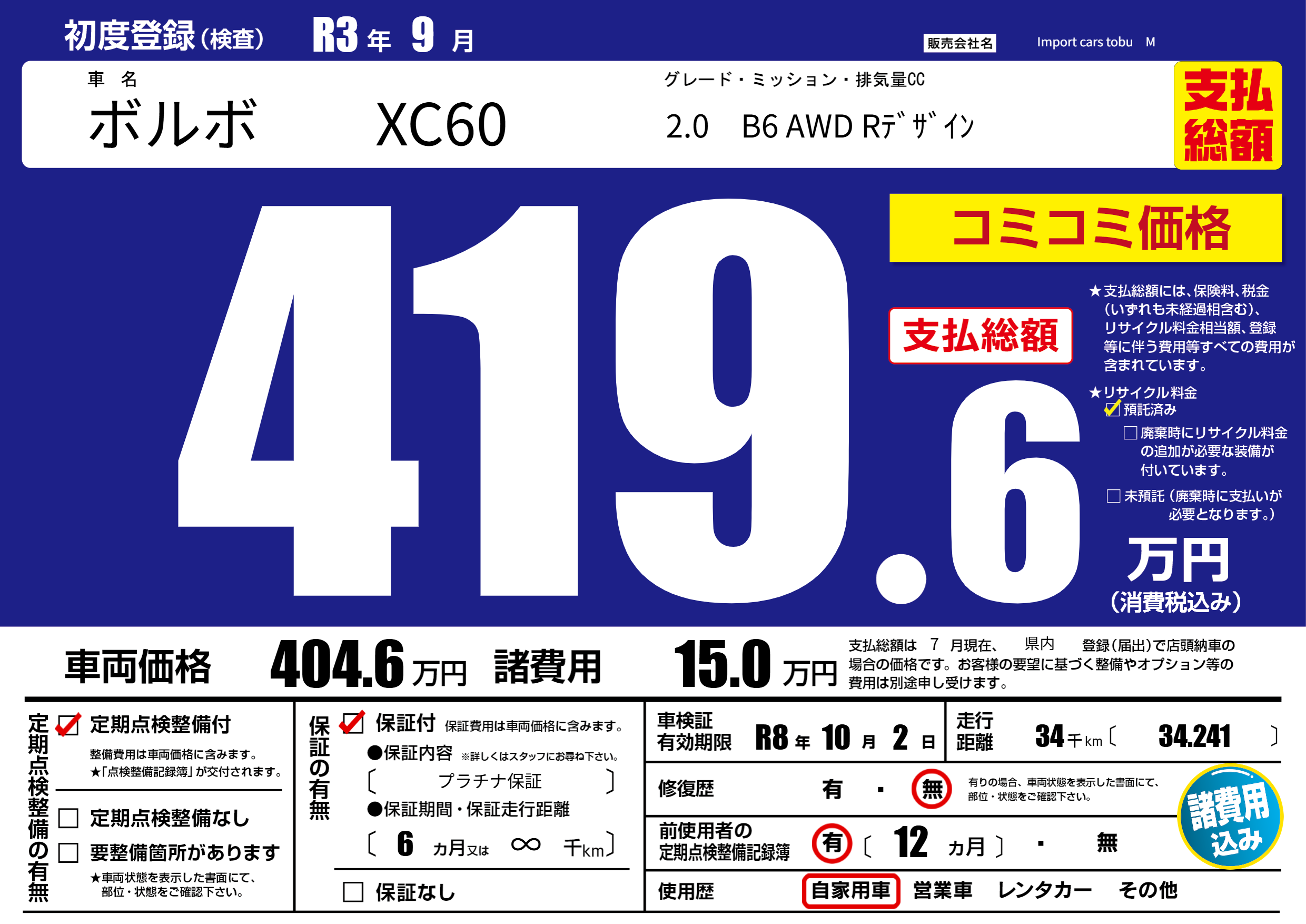| 車名 | ボルボ XC60 | グレード ミッション 排気量 |