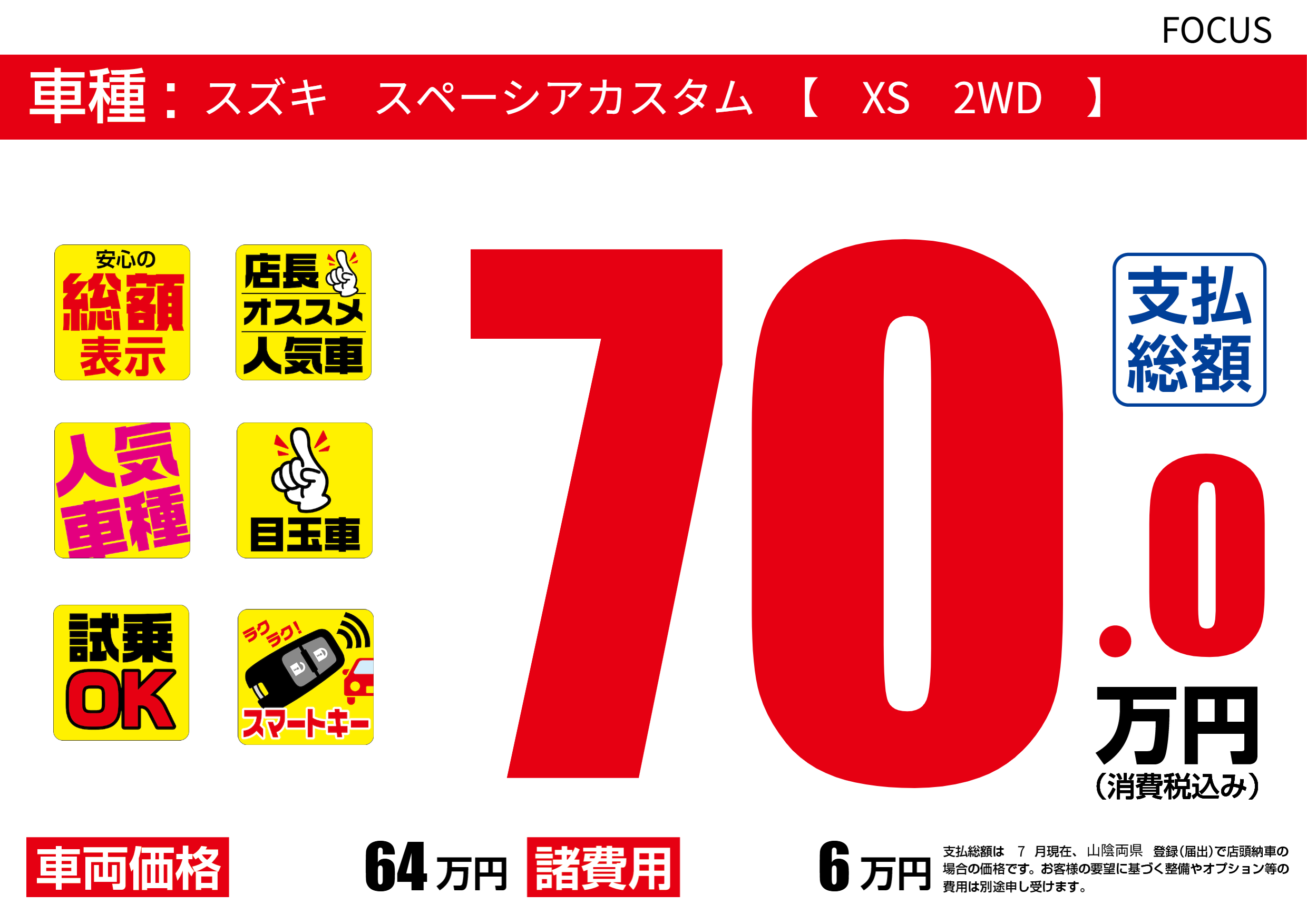 | 車名 | スズキ スペーシアカスタム 【 XS 2WD 】 | グレード ミッション 排気量 |