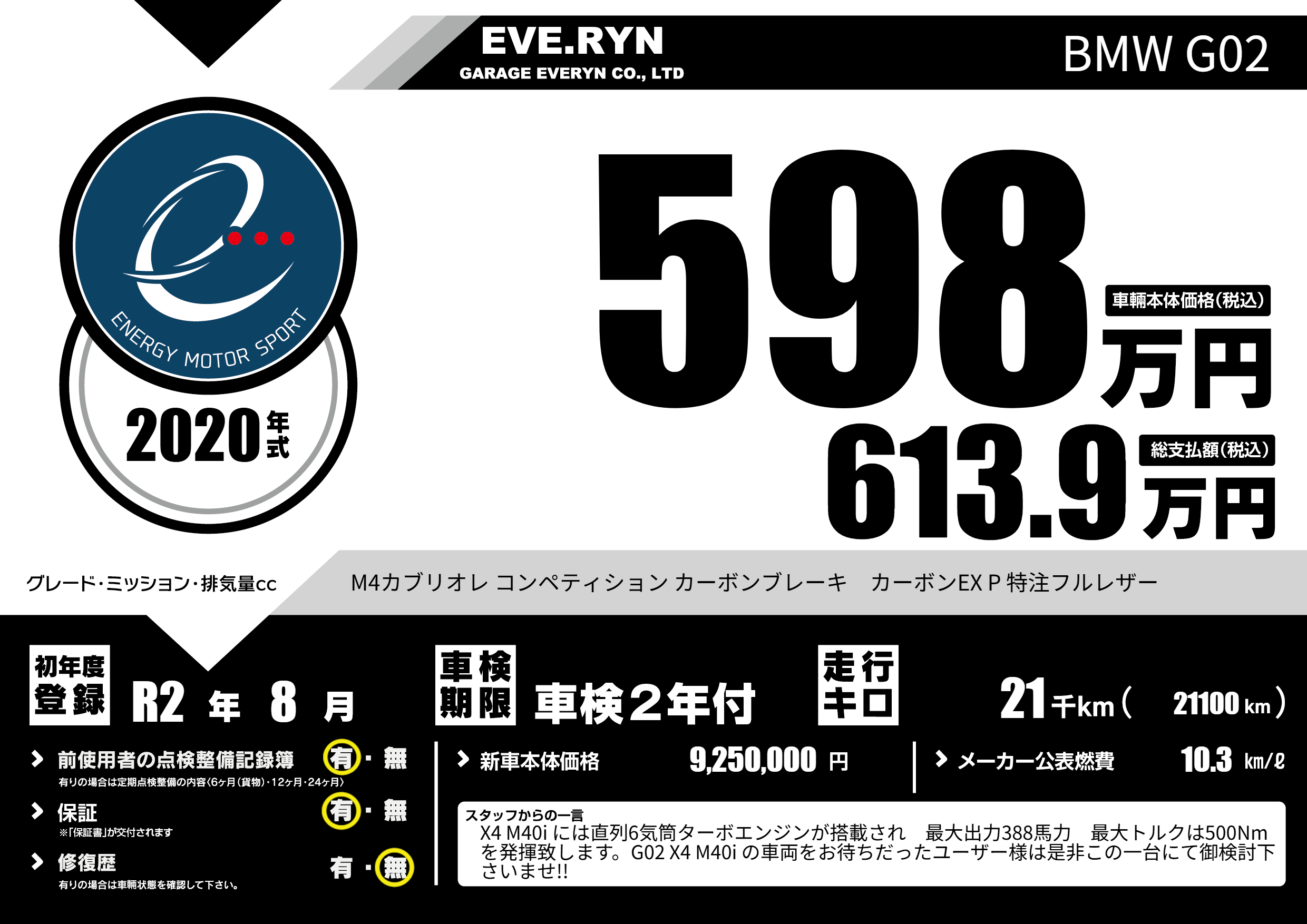 | 車名 | BMW G02 | グレード ミッション 排気量 |