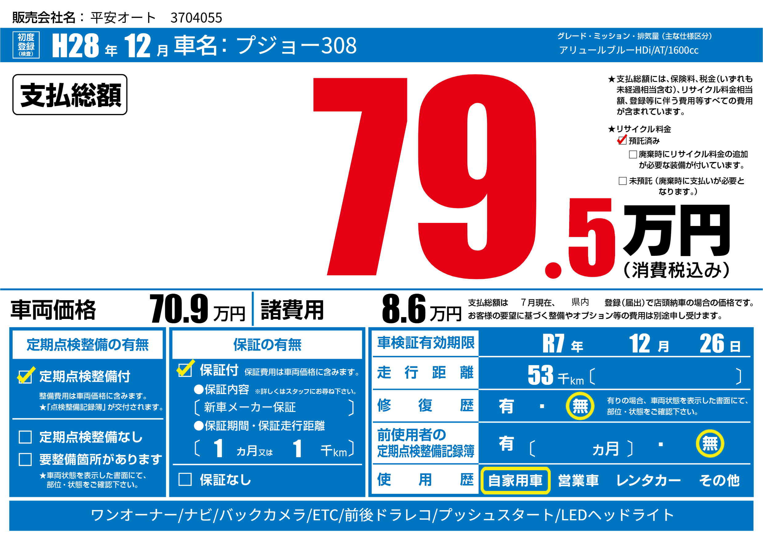 | 車名 | プジョー308 | グレード ミッション 排気量 |