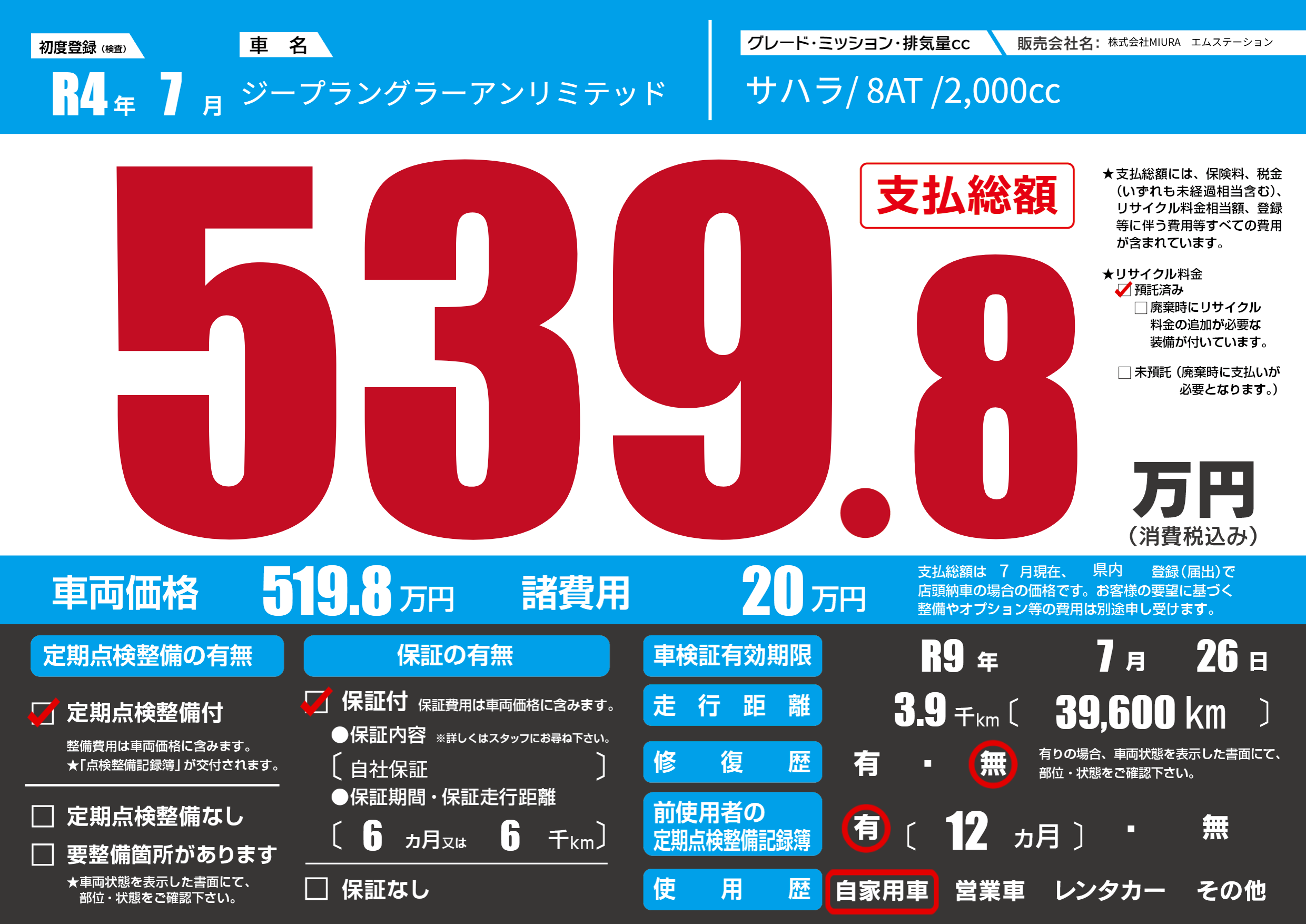 なし | 車検制限 | R9年7月26月 |