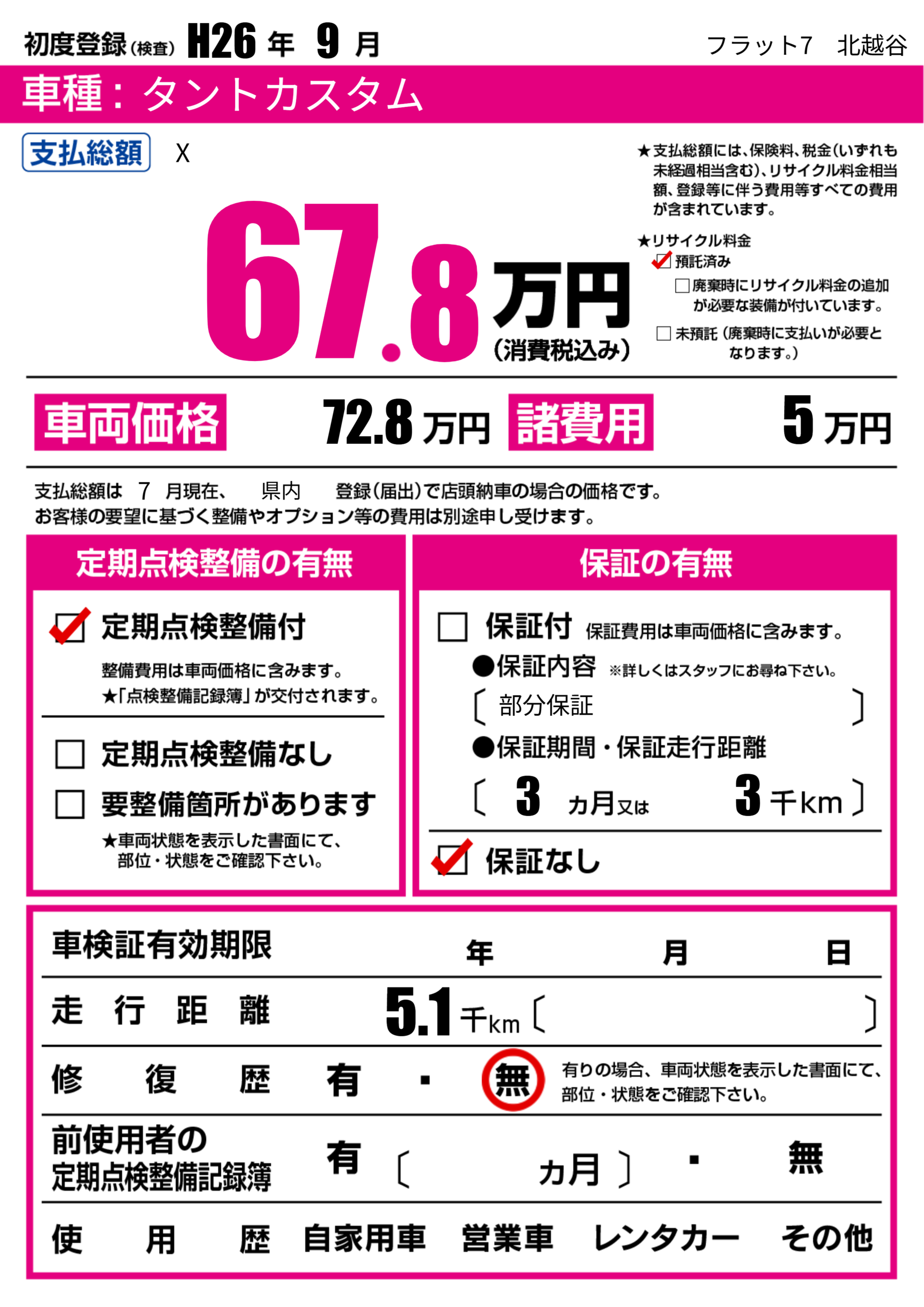 | 車名 | タントカスタム | グレード ミッション 排気量 |