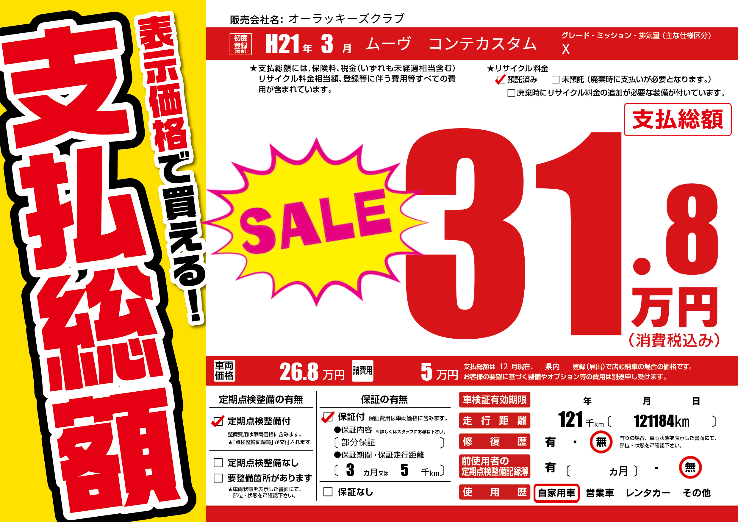| 走行キロ | 12.1万km | 初年度登録 | H21年3月 |