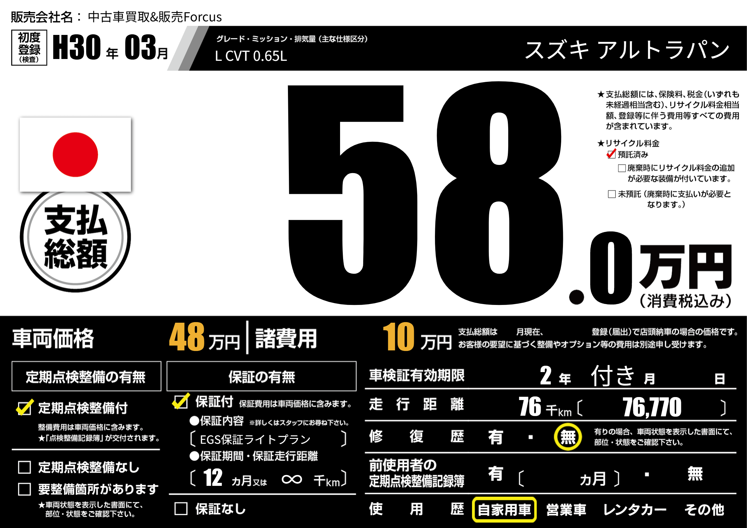 | 走行キロ | 7.6万km | 初年度登録 | H30年03月 |