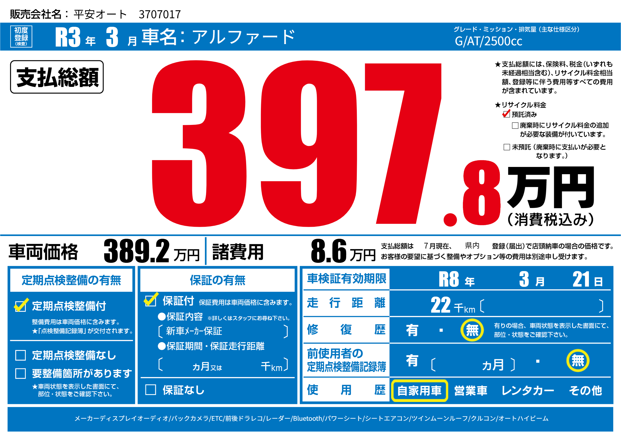 | 車検制限 | R8年 3月 21日 | ||