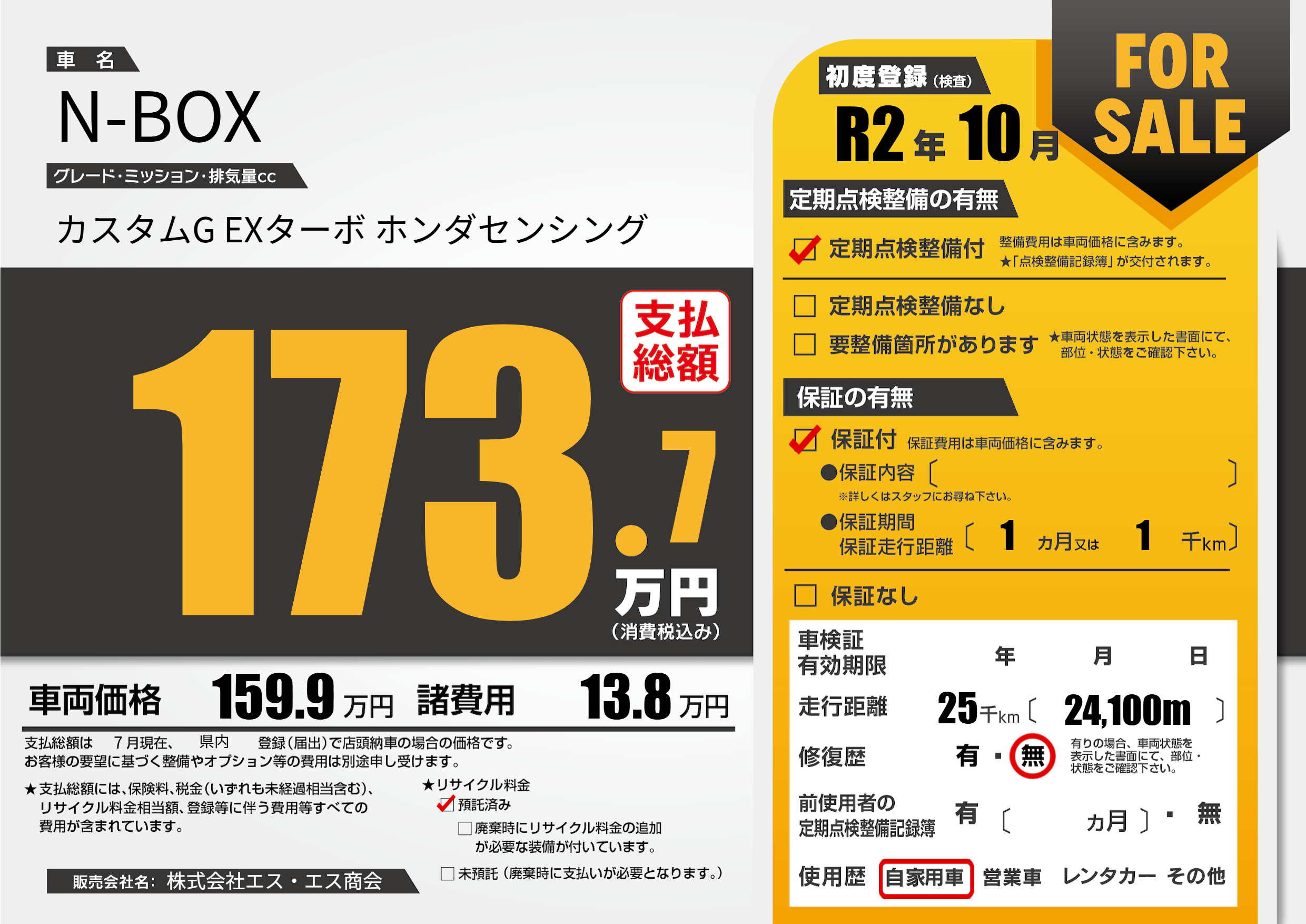 | 車名 | N-BOX | グレード ミッション 排気量 |