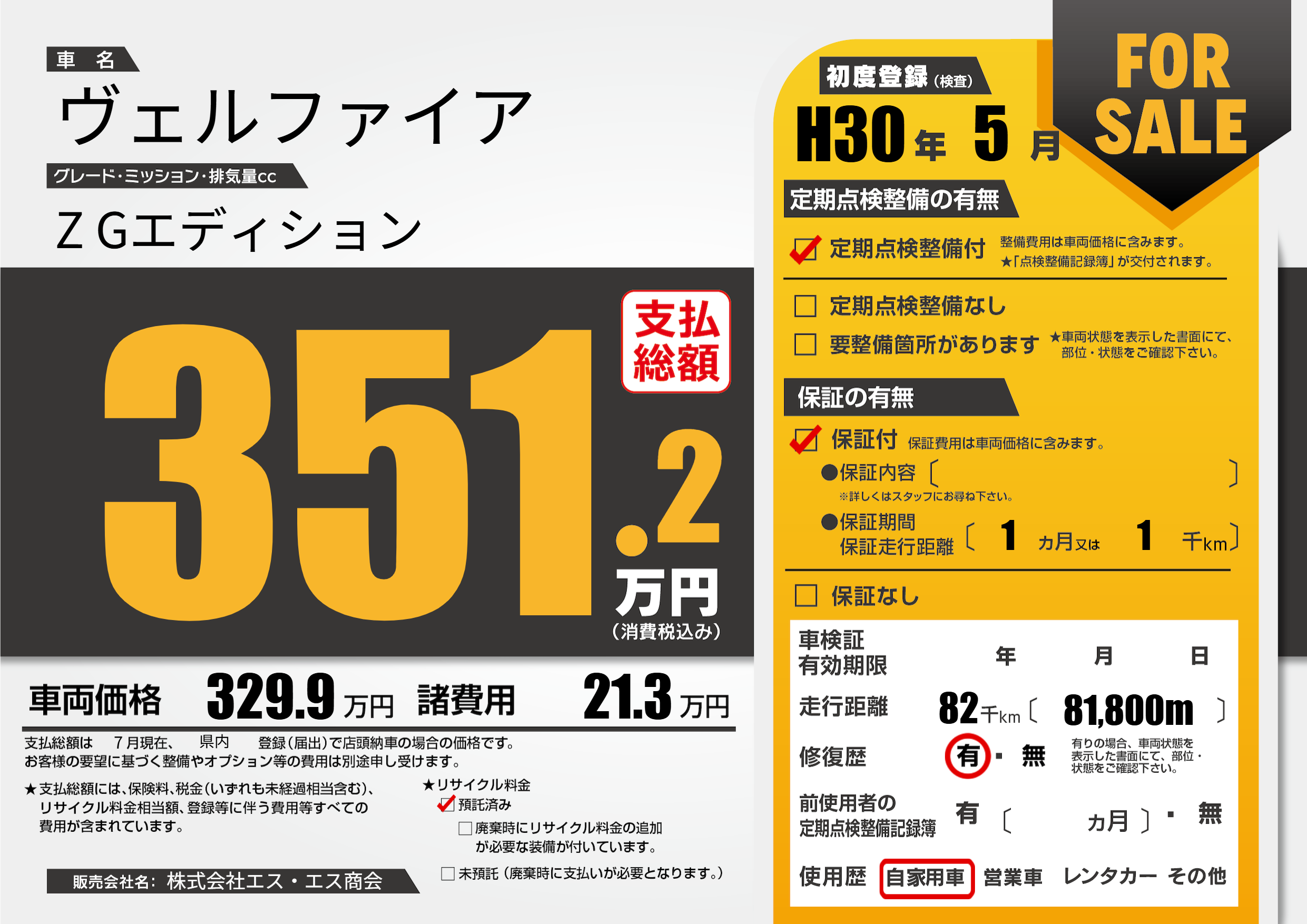 | 走行キロ | 8.2万km | 初年度登録 | H30年5月 |