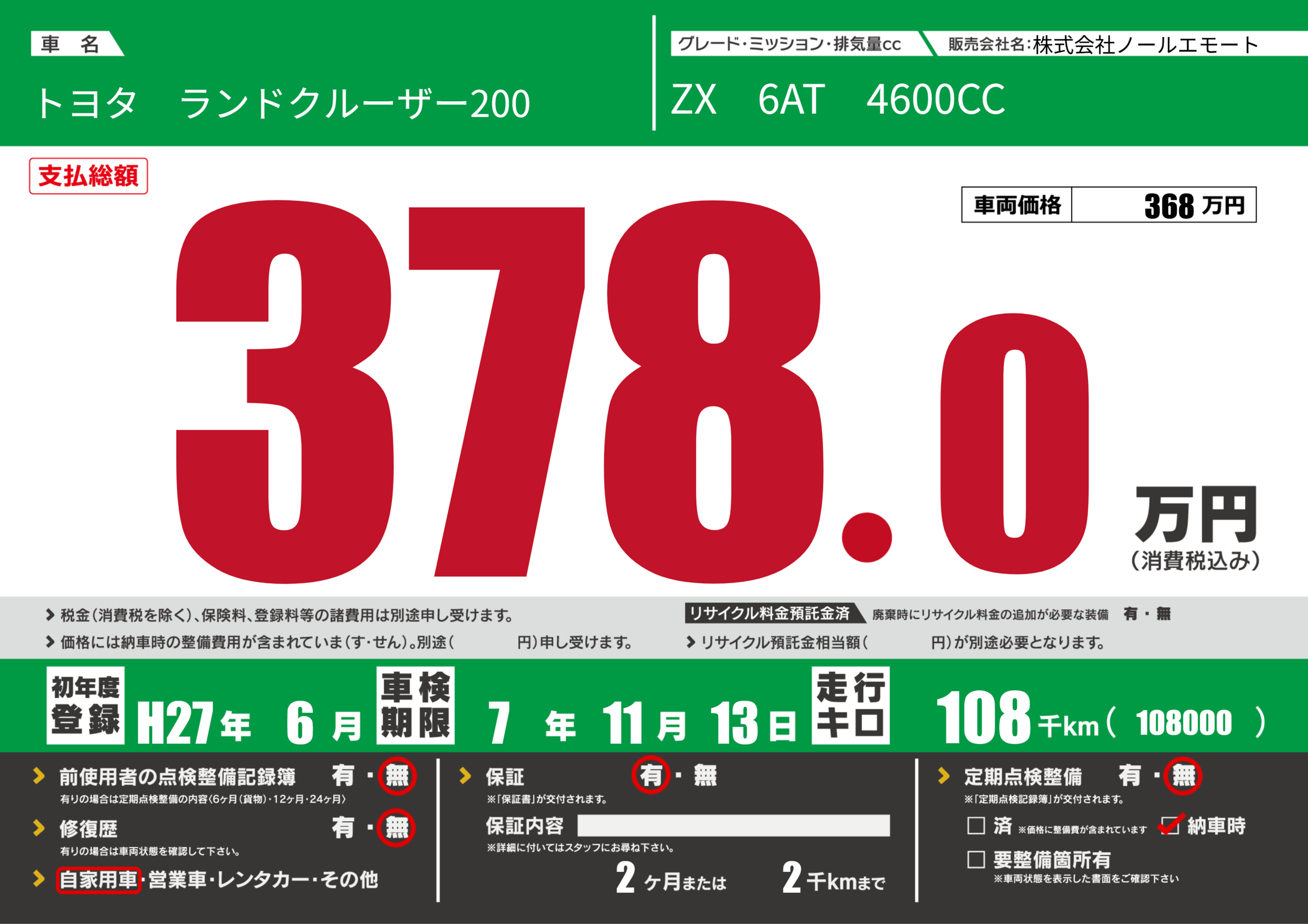 | 車名 | トヨタ ランドクルーザー200 | グレード ミッション 排気量 |