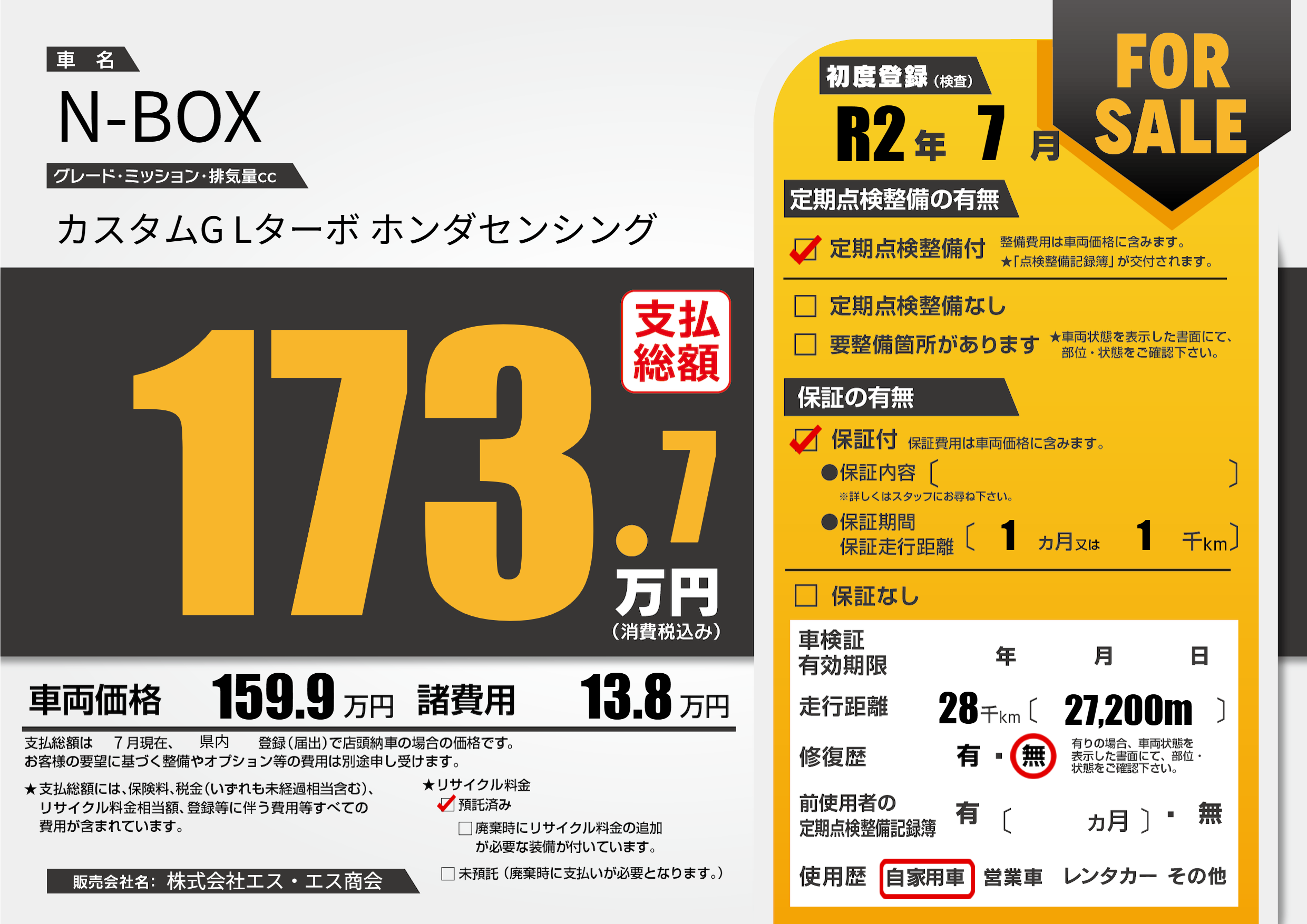 | 車名 | N-BOX | グレード ミッション 排気量 |