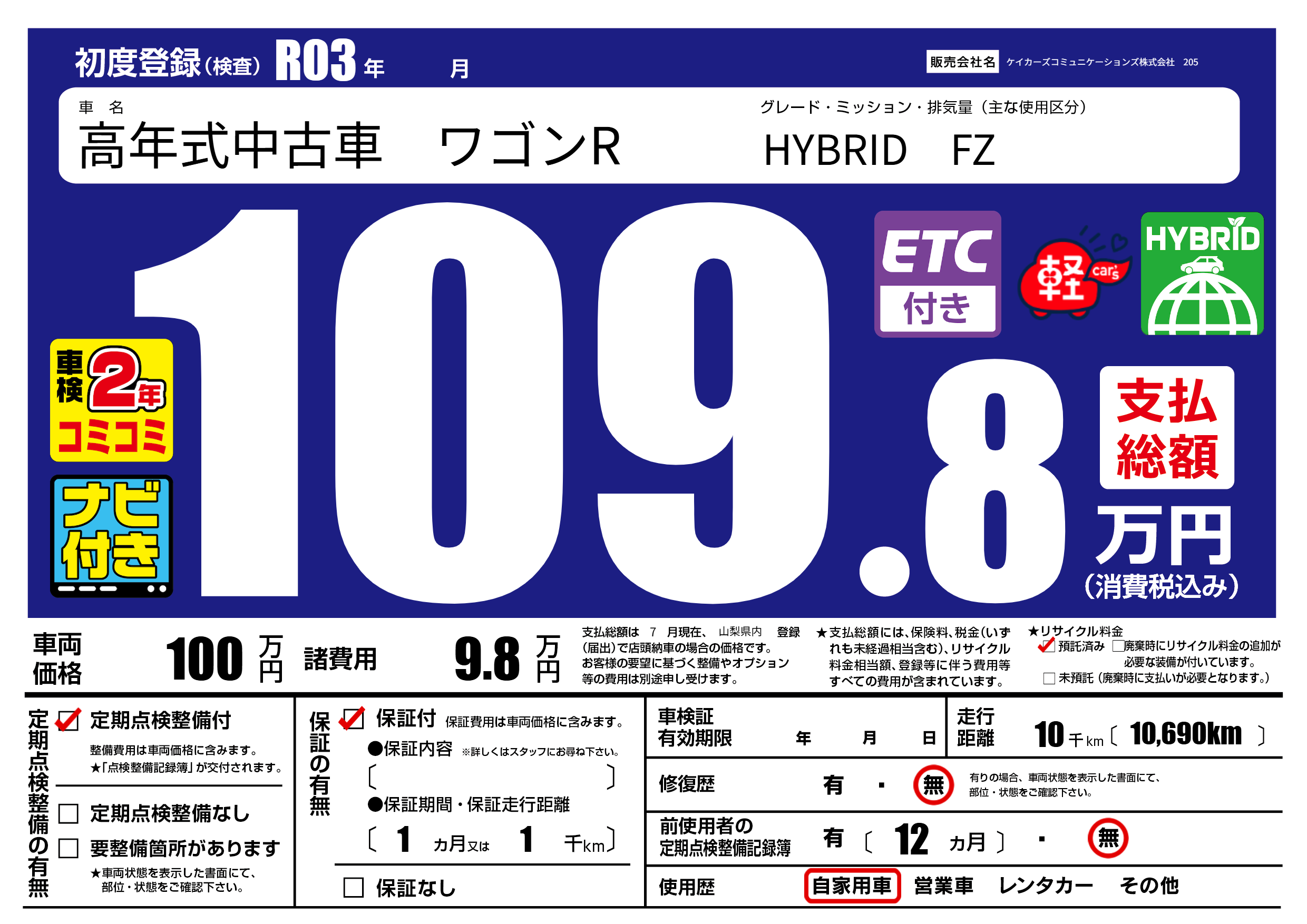 | 走行キロ | 1万km | 初年度登録 | R03年---月 |