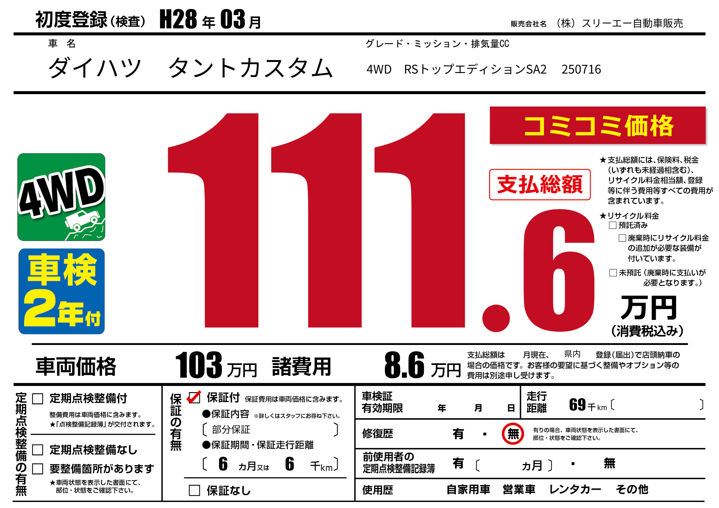 | 走行キロ | 6.9万km | 初年度登録 | H28年03月 |