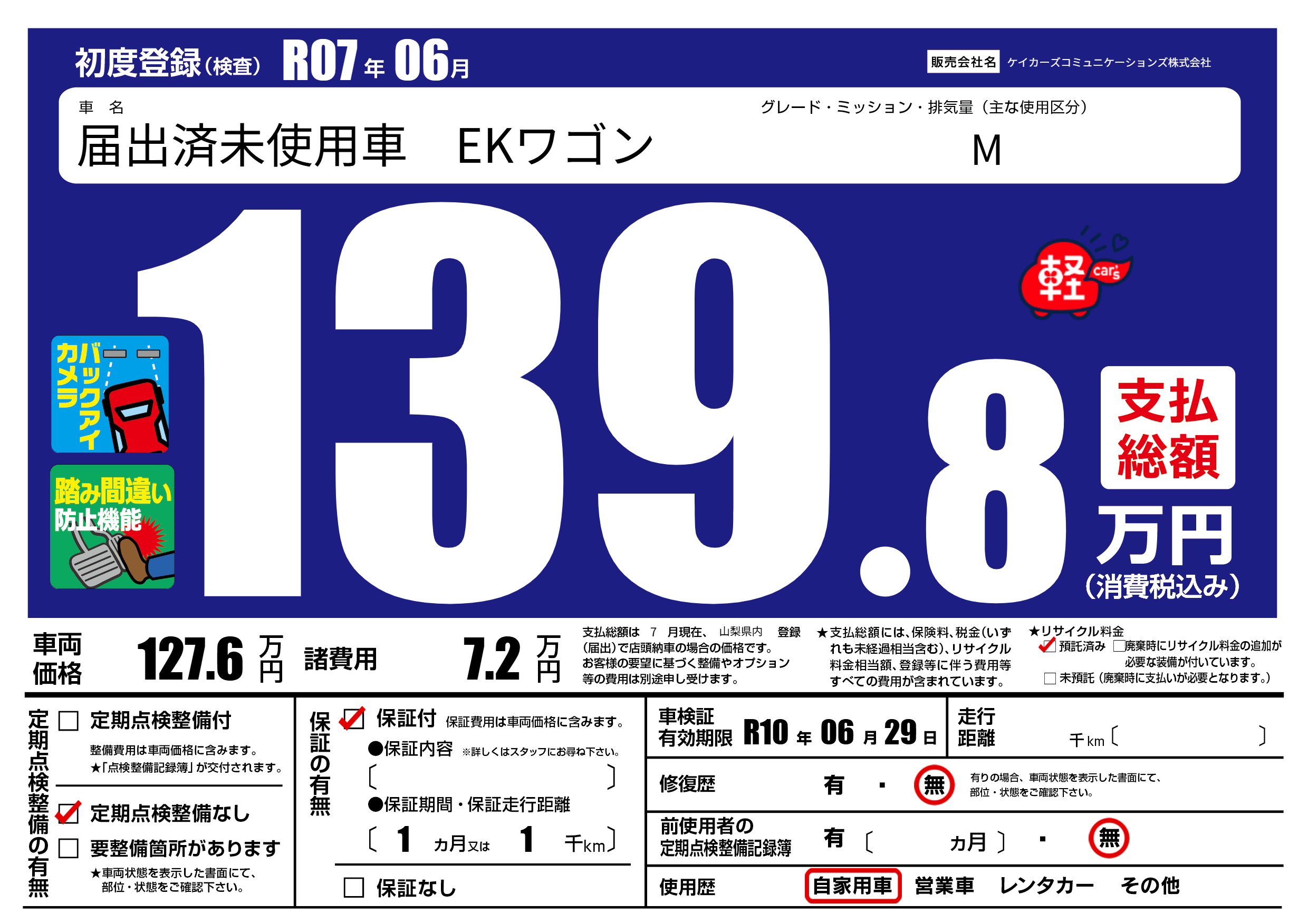 | 車名 | 届出済未使用車 EKワゴン | グレード ミッション 排気量 |
