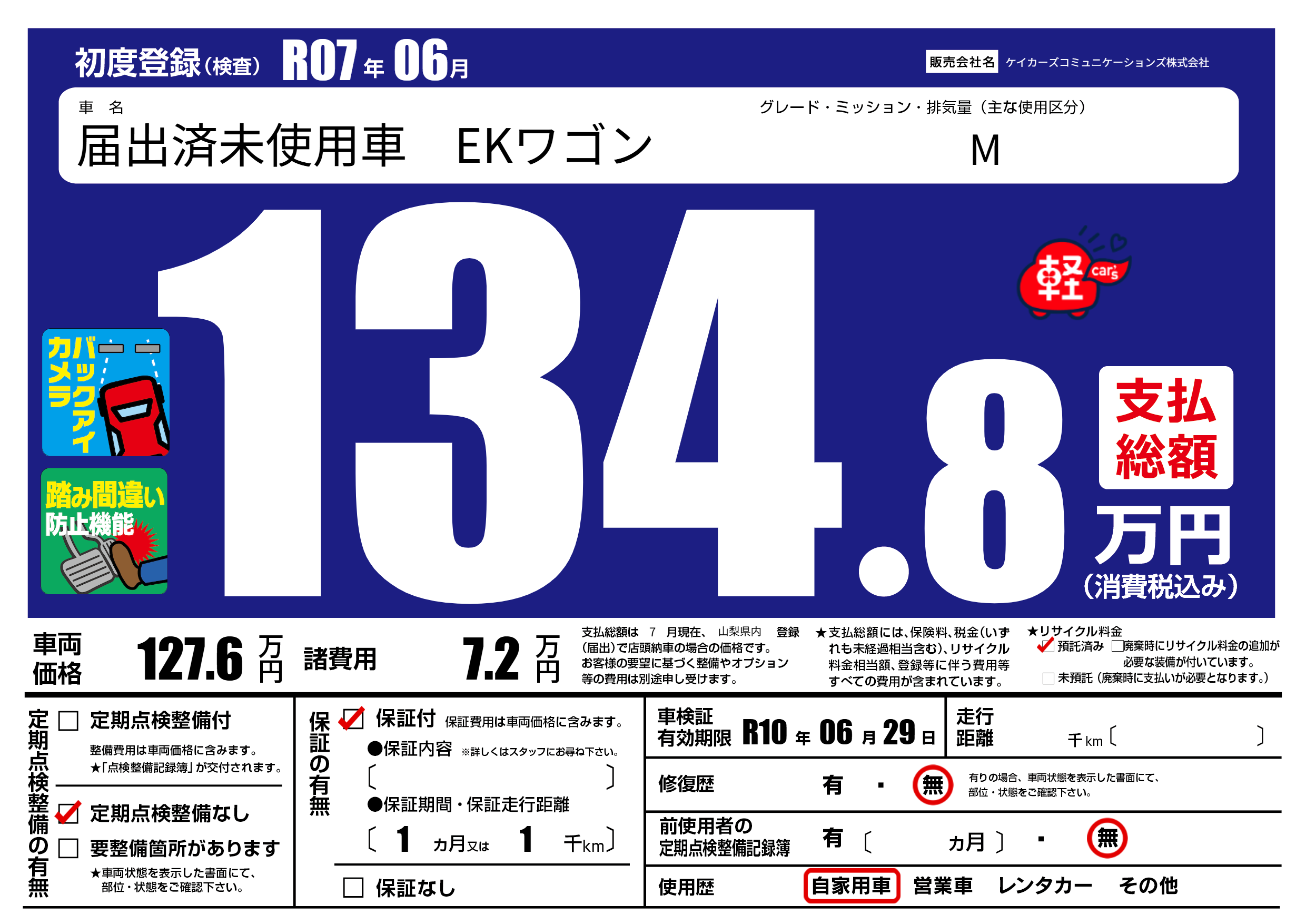 | 車名 | 届出済未使用車 EKワゴン | グレード ミッション 排気量 |