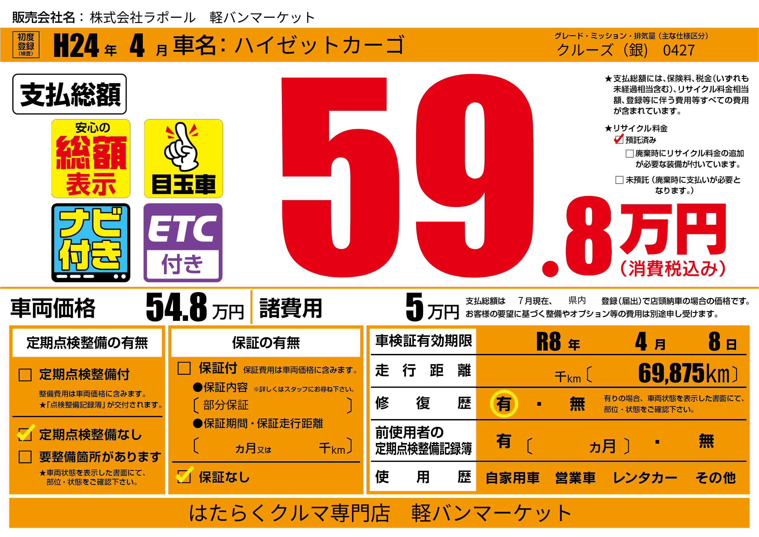 | 車名 | ハイゼットカーゴ | グレード ミッション 排気量 |