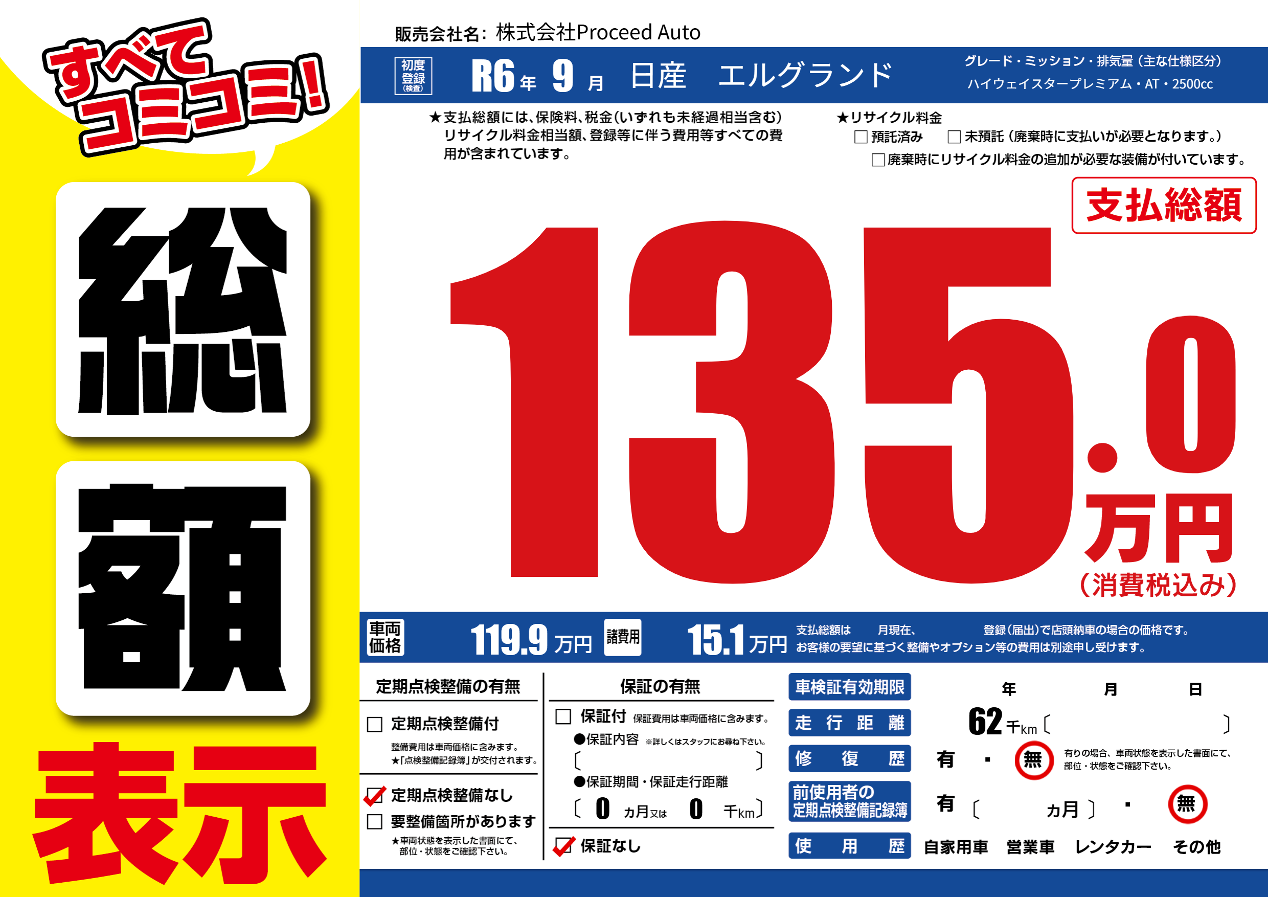 | 車名 | 日産 エルグランド | グレード ミッション 排気量 |