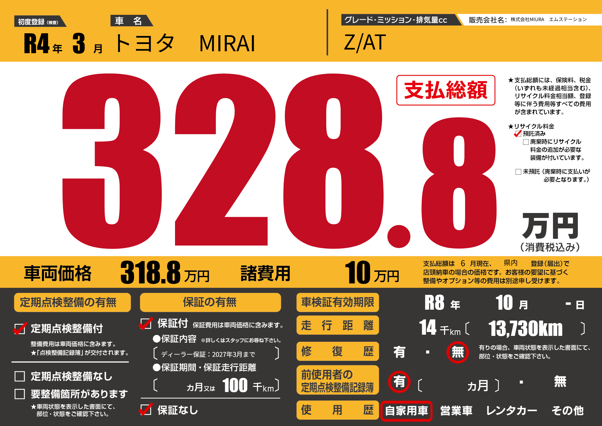 | 車名 | トヨタ MIRAI | グレード ミッション 排気量 |