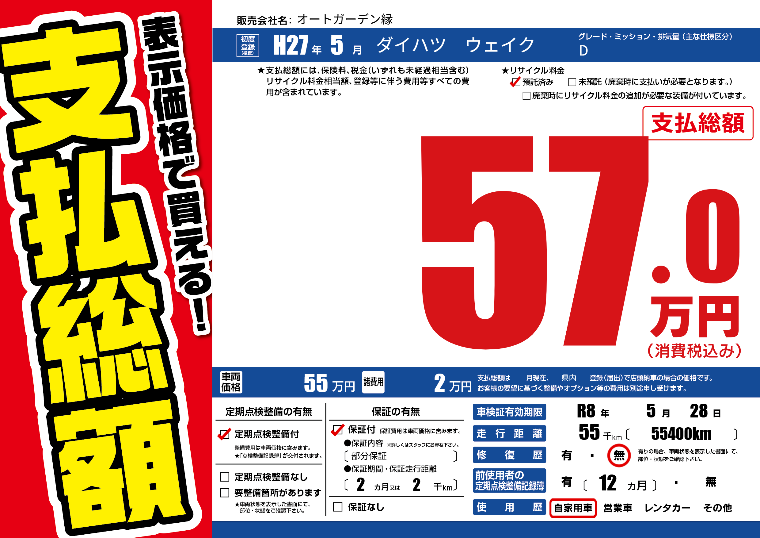 | 走行キロ | 5.5万km | 初年度登録 | H27年5月 |