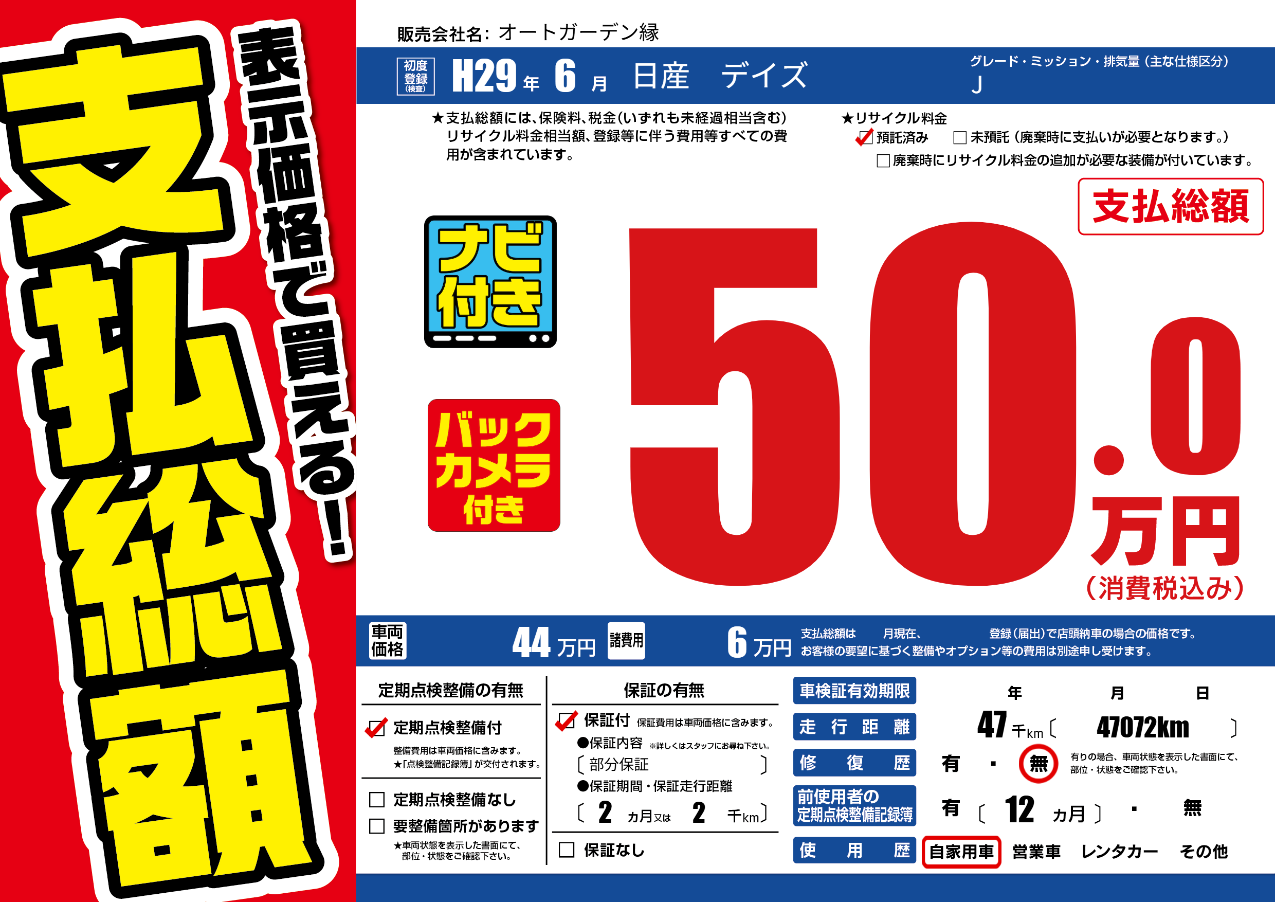 | 車名 | 日産 デイズ | グレード ミッション 排気量 |